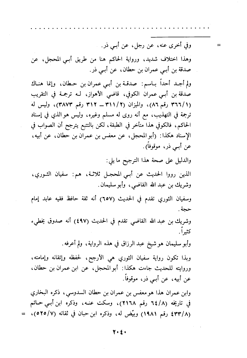وبذا تكون رواية سفيان الثوري هي الأرجح، لحفظه وإتقانه وإمامته، وروايته للحديث جاءت هكذا: أبو المحجل، عن ابن عمران بن حطان، عن أبيه، عن أبي ذر، موقوفاً.