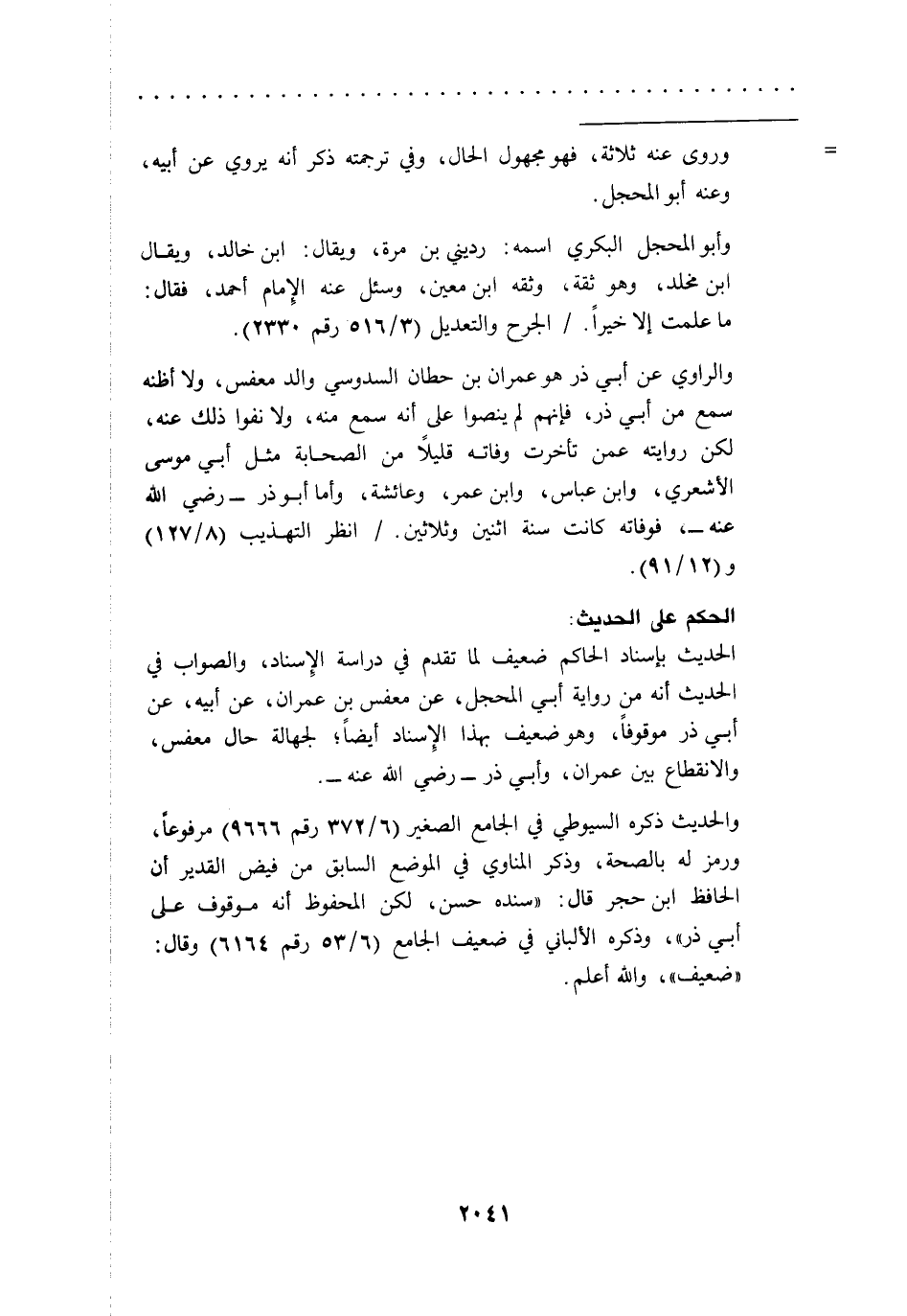الحديث بإسناد الحاكم ضعيف لما تقدم في دراسة الِإسناد، والصواب في الحديث أنه من رواية أبي المحجل، عن معفس بن عمران، عن أبيه، عن أبي ذر موقوفاً، وهو ضعيف بهذا الِإسناد أيضاً؛ لجهالة حال معفس، والانقطاع بين عمران، وأبي ذر -رضي الله عنه-.