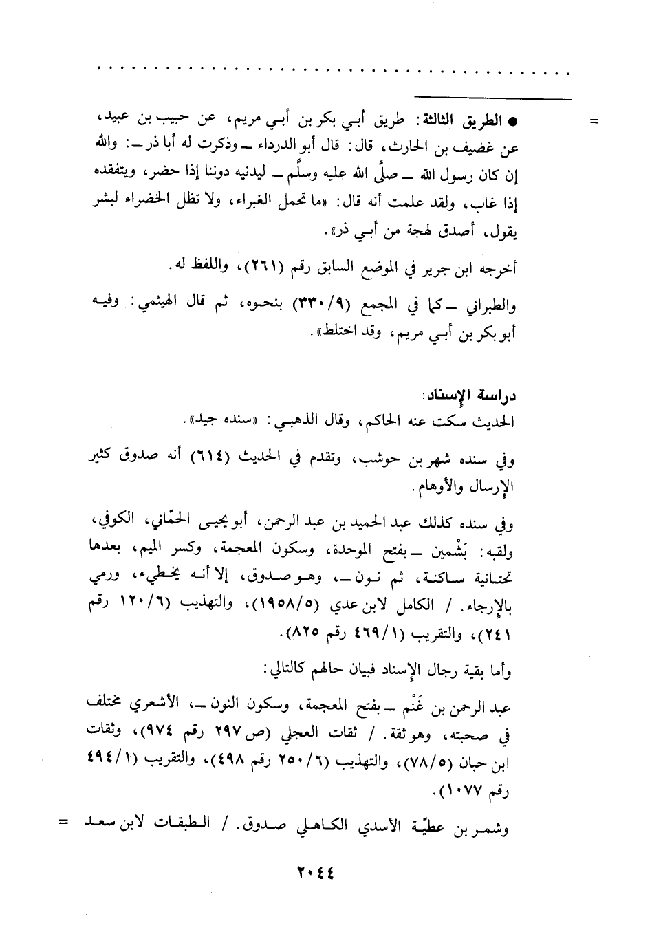 * الطريق الثالثة: طريق أبي بكر بن أبي مريم، عن حبيب بن عبيد، عن غضيف بن الحارث، قال: قال أبو الدرداء -وذكرت له أبا ذر-: والله إن كان رسول الله -صلى الله عليه وسلَّم- ليدنيه دوننا إذا حضر، ويتفقده إذا غاب، ولقد علمت أنه قال: "ما تحمل الغبراء، ولا تظل الخضراء لبشر يقول، أصدق لهجة من أبي ذر".