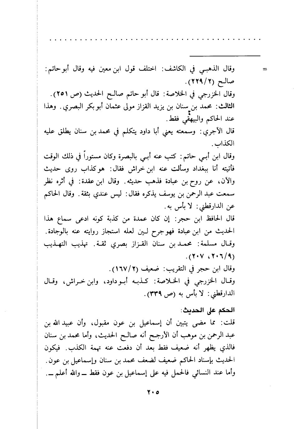 قلت: مما مضى يتبين أن إسماعيل بن عون مقبول، وأن عبيد الله بن عبد الرحمن بن موهب أن الأرجح أنه صالح الحديث، وأما محمد بن سنان فالذي يظهر أنه ضعيف فقط بعد أن دفعت عنه تهمة الكذب. فيكون الحديث بإسناد الحاكم ضعيف لضعف محمد بن سنان وإسماعيل بن عون.
