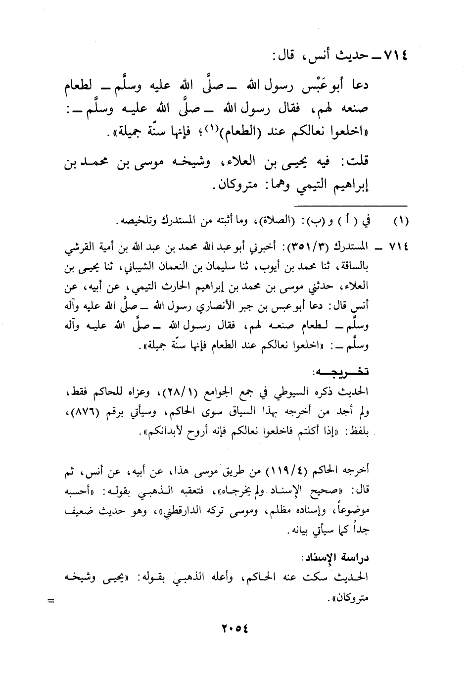 714 - المستدرك (3/ 351): أخبرني أبو عبد الله محمد بن عبد الله بن أمية القرشي بالساقة، ثنا محمد بن أيوب، ثنا سليمان بن النعمان الشيباني، ثنا يحيى بن العلاء، حدثني موسى بن محمد بن إبراهيم الحارث التيمي، عن إبيه، عن أنس قال: دعا أبو عبس بن جبر الأنصاري رسول الله -صلى الله عليه وآله وسلم- لطعام صنعه لهم، فقال رسول الله -صلى الله عليه وآله وسلم-: "اخلعوا نعالكم عند الطعام فإنها سنّة جميلة".