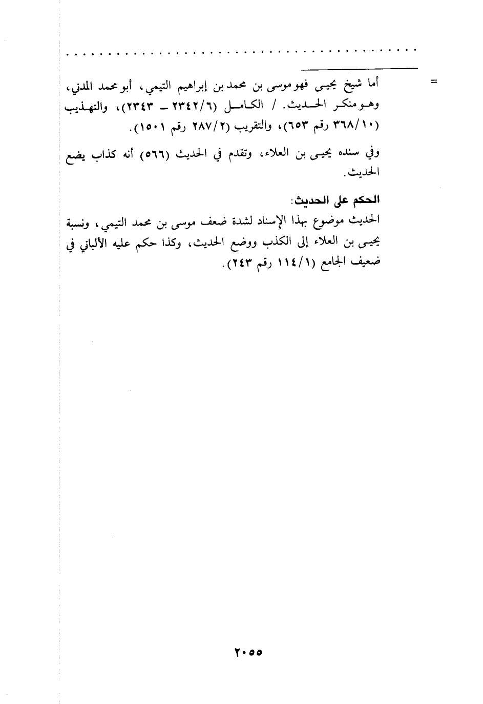 = أما شيخ يحيى فهو موسى بن محمد بن إبراهيم التيمي، أبو محمد المدني، وهو منكر الحديث./ الكامل (6/ 2342 - 2343)، والتهذيب (10/ 368رقم 653)، والتقريب (2/ 287رقم 1501).