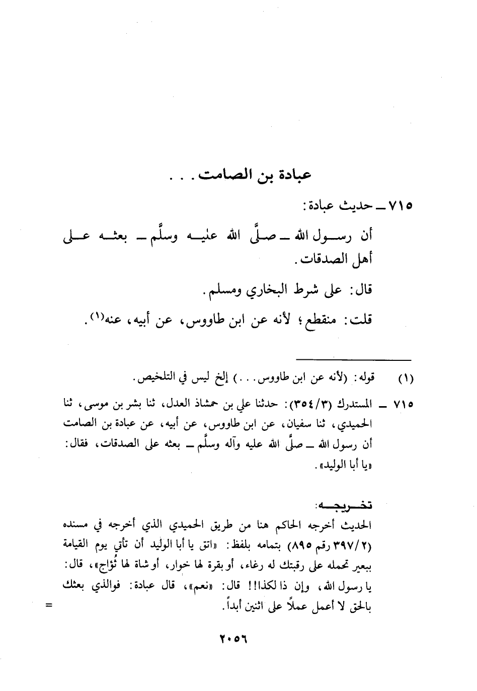 715 - المستدرك (3/ 354): حدثنا علي بن حمشاذ العدل، ثنا بشر بن موسى، ثنا الحميدي، ثنا سفيان، عن ابن طاووس، عن أبيه، عن عبادة بن الصامت أن رسول الله -صلى الله عليه وآله وسلم- بعثه على الصدقات، فقال: "يا أبا الوليد".