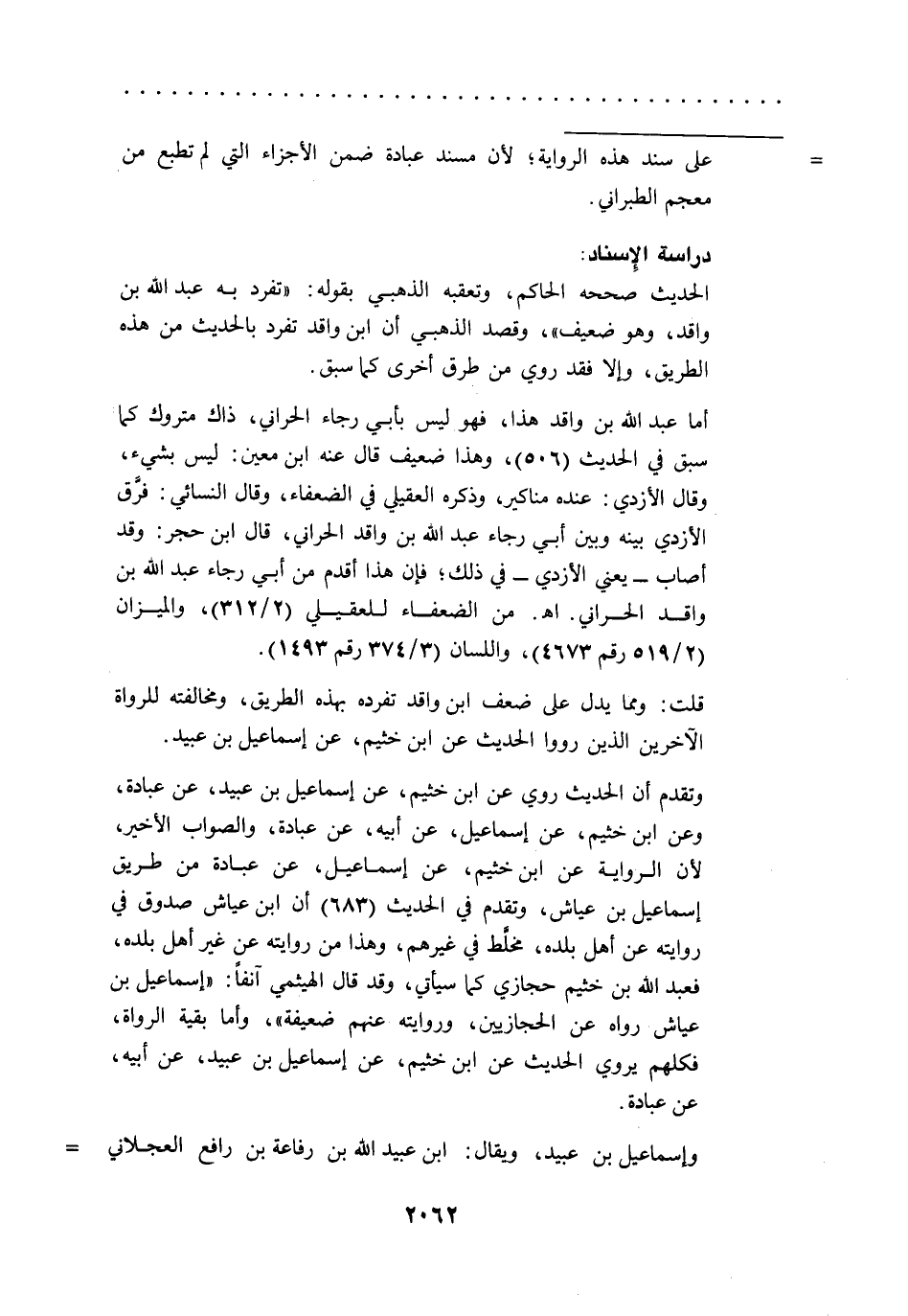 قلت: ومما يدل على ضعف ابن واقد تفرده بهذه الطريق، ومخالفته للرواة الآخرين الذين رووا الحديث عن ابن خثيم، عن إسماعيل بن عبيد.