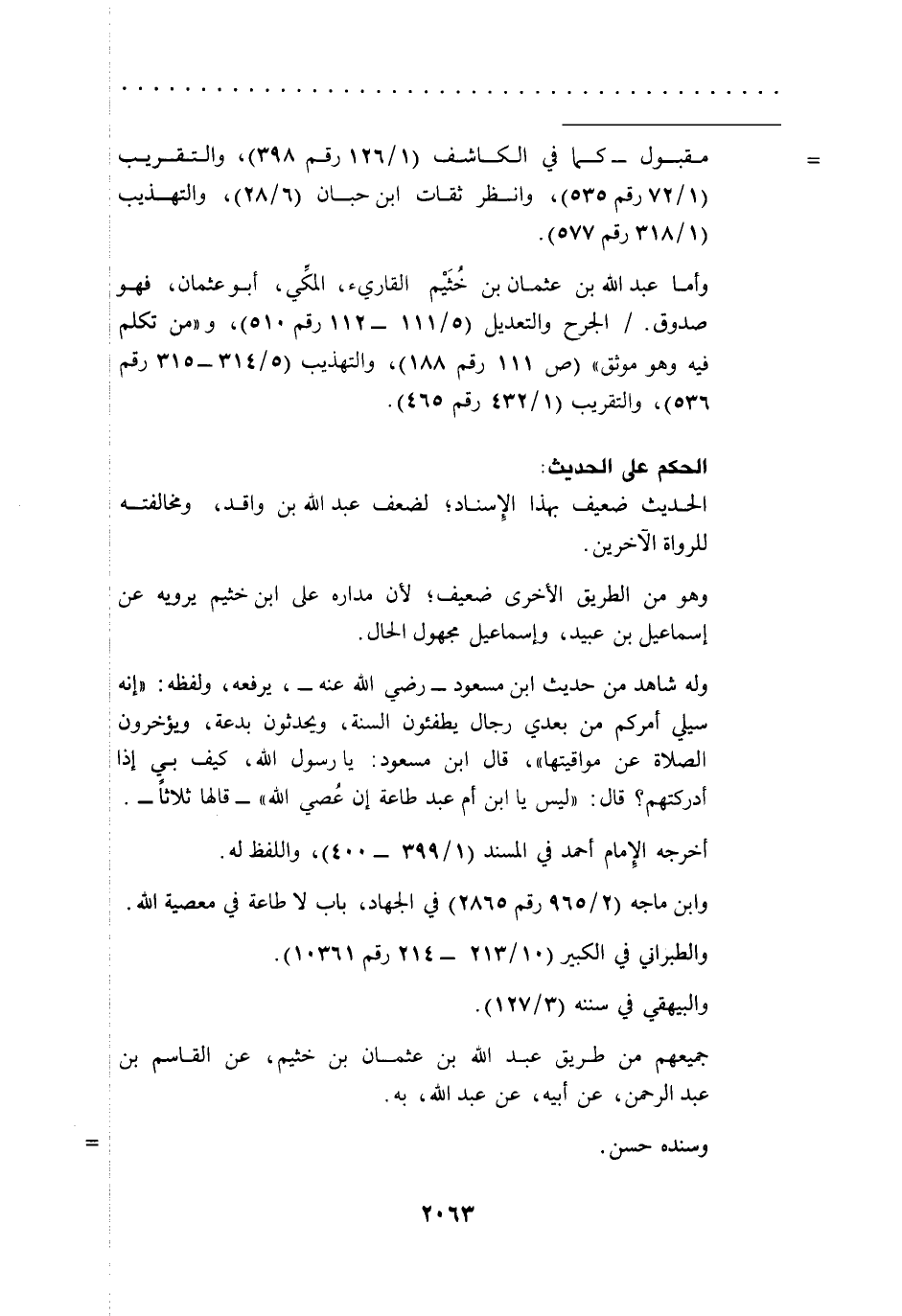 وأما عبد الله بن عثمان بن خُثَيْم القاريء، المكِّي، أبو عثمان، فهو صدوق./ الجرح والتعديل (5/ 111 - 112 رقم 510)، و"من تكلم فيه وهو موثق" (ص111رقم188)، والتهذيب (5/ 314 - 315رقم 536)، والتقريب (1/ 432 رقم 465).