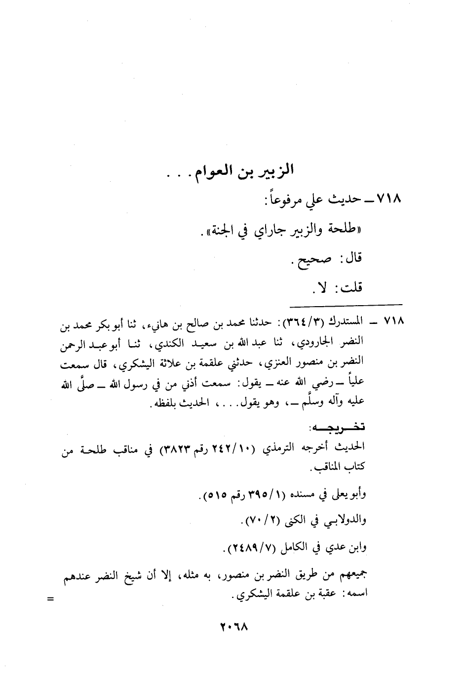 718 - المستدرك (3/ 364): حدثنا محمد بن صالح بن هانيء، ثنا أبو بكر محمد بن النضر الجارودي، ثنا عبد الله بن سعيد الكندي، ثنا أبو عبد الرحمن النضر بن منصور العنزي، حدثني علقمة بن علاثة اليشكري، قال سمعت علياً -رضي الله عنه- يقول: سمعت أذني من في رسول الله -صلَّى الله عليه وآله وسلم-، وهو يقول ... ، الحديث بلفظه.