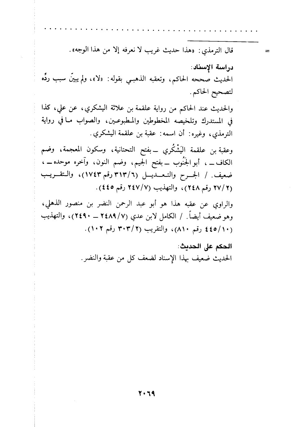 والراوي عن عقبه هذا هو أبو عبد الرحمن النضر بن منصور الذهلي، وهو ضعيف أيضاً./ الكامل لابن عدي (7/ 2489 - 2490)، والتهذيب (10/ 445 رقم 810)، والتقريب (2/ 303 رقم 102).