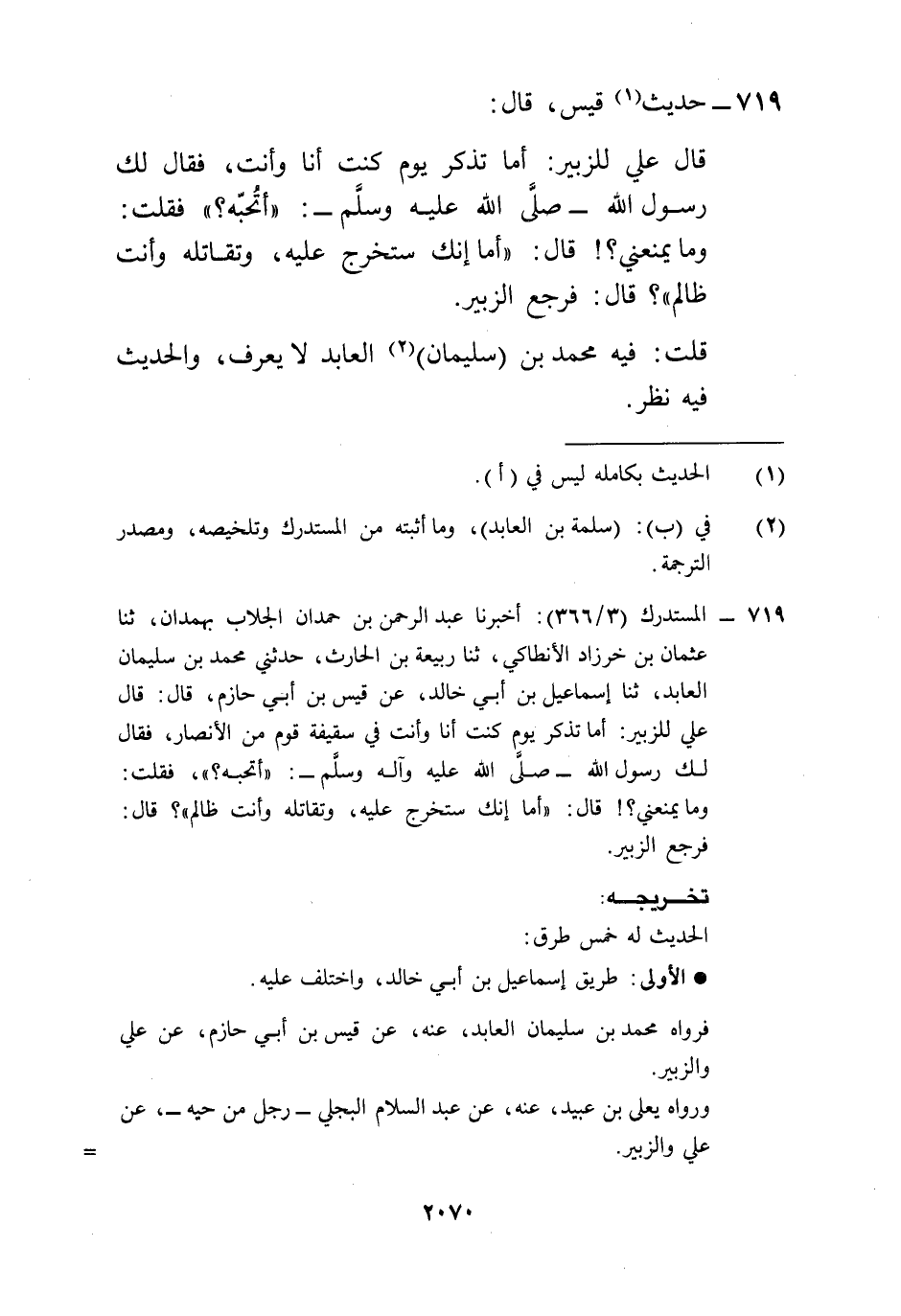 719 - المستدرك (3/ 366): أخبرنا عبد الرحمن بن حمدان الجلاب بهمدان، ثنا عثمان بن خرزاد الأنطاكي، ثنا ربيعة بن الحارث، حدثني محمد بن سليمان العابد، ثنا إسماعيل بن أبي خالد، عن قيس بن أبي حازم، قال: قال علي للزبير: أما تذكر يوم كنت أنا وأنت في سقيفة قوم من الأنصار، فقال لك رسول الله -صلَّى الله عليه وآله وسلَّم-: "أتحبه؟ "، فقلت: وما يمنعني؟! قال: "أما إنك ستخرج عليه، وتقاتله وأنت ظالم"؟ قال: فرجع الزبير.