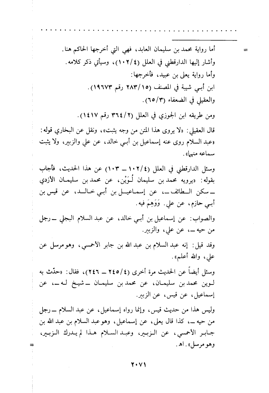 وليس هذا من حديث قيس، وإنما رواه إسماعيل، عن عبد السلام -رجل من حيه-، كذا قال يعلى، عن إسماعيل، وهو عبد السلام بن عبد الله بن جابر الأحمسي، عن الزبير، وعبد السلام هذا لم يدرك الزبير، وهو مرسل"اهـ. =