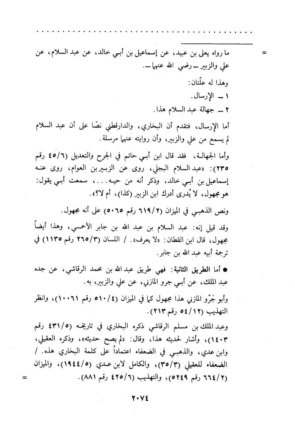 وأما الجهالة، فقد قال ابن أبي حاتم في الجرح والتعديل (6/ 45رقم 235): "عبد السلام البجلي، روى عن الزبير بن العوام، روى عنه إسماعيل بن أبي خالد، وذكر أنه من حيه ... ، سمعت أبي يقول: هو مجهول، لا يُدرى أدرك ابن الزبير (كذا)، أم لا؟ ".