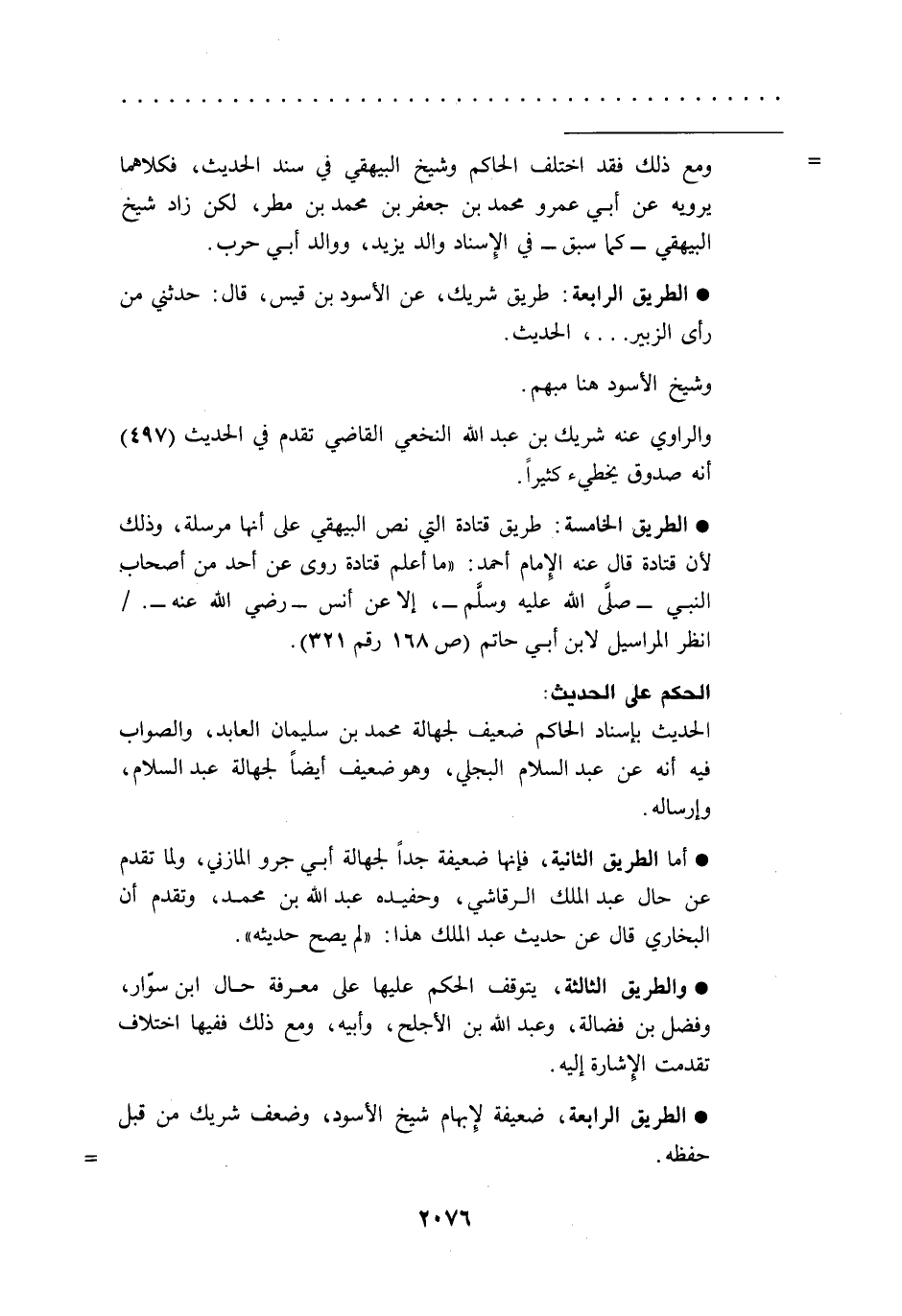 * الطريق الخامسة: طريق قتادة التي نص البيهقي على أنها مرسلة، وذلك لأن قتادة قال عنه الِإمام أحمد: "ما أعلم قتادة روى عن أحد من أصحاب النبي -صلى الله عليه وسلم-، إلا عن أنس -رضي الله عنه-./ انظر المراسيل لابن أبي حاتم (ص 168 رقم 321).