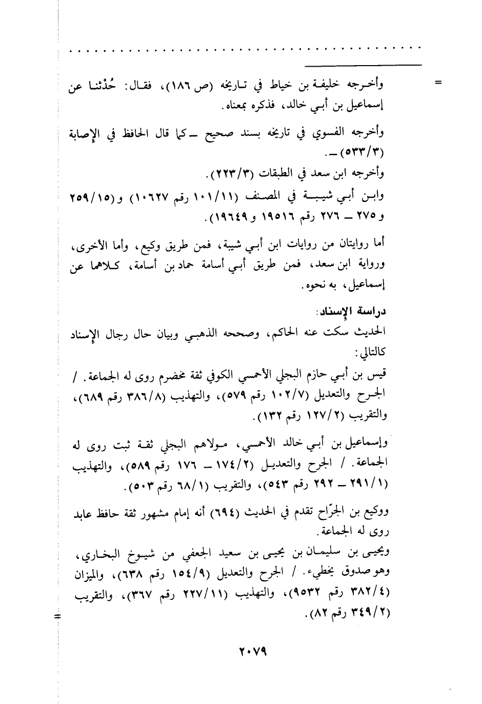 وإسماعيل بن أبي خالد الأحمسي، مولاهم البجلي ثقة ثبت روى له الجماعة./ الجرح والتعديل (2/ 174 - 176 رقم 589)، والتهذيب (1/ 291 - 292 رقم 543)، والتقريب (1/ 68 رقم503).