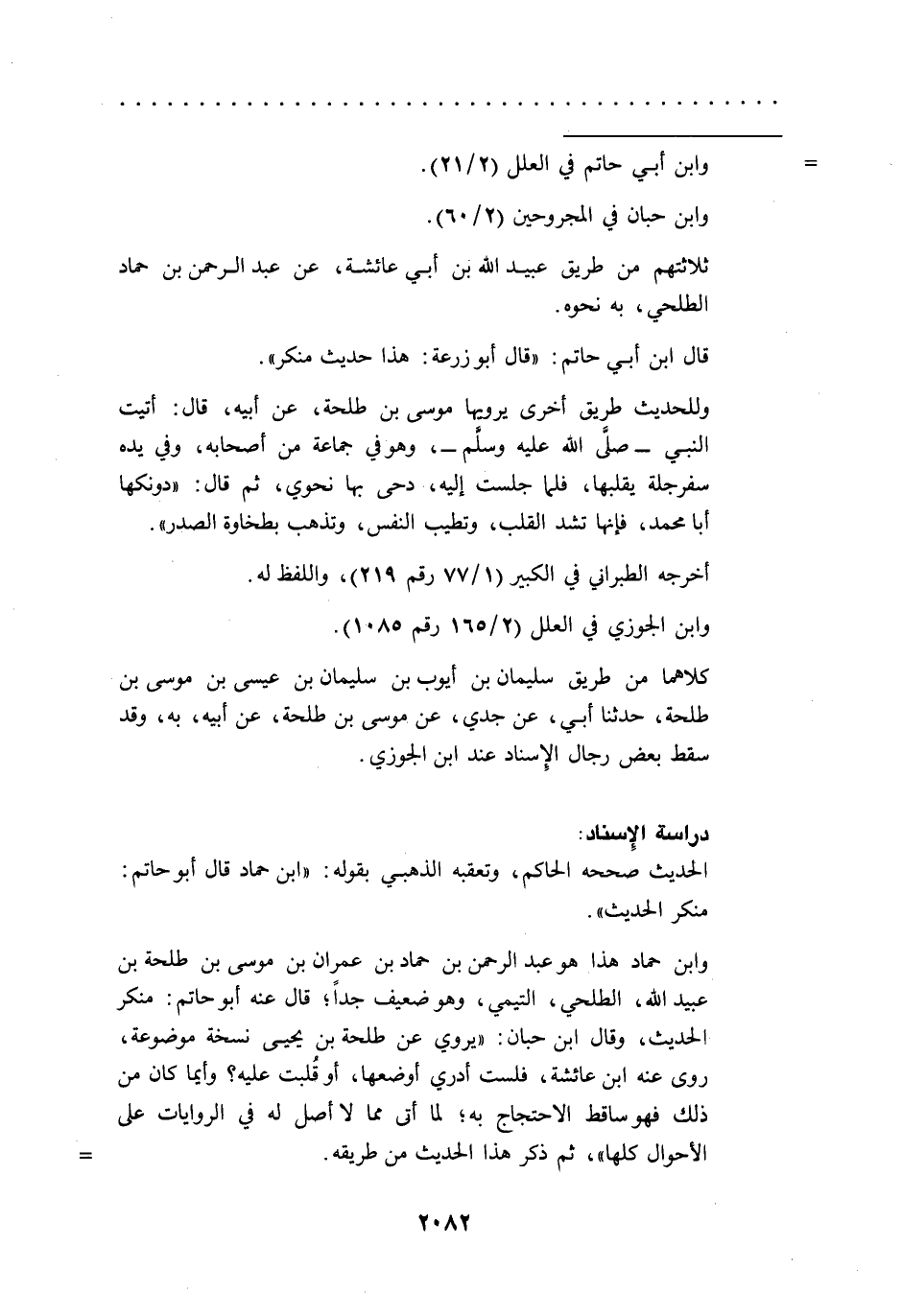وابن حماد هذا هو عبد الرحمن بن حماد بن عمران بن موسى بن طلحة بن عبيد الله، الطلحي، التيمي، وهو ضعيف جداً؛ قال عنه أبو حاتم: منكر الحديث، وقال ابن حبان: "يروي عن طلحة بن يحيى نسخة موضوعة، روى عنه ابن عائشة، فلست أدري أوضعها، أو قُلبت عليه؟ وأيما كان من ذلك فهو ساقط الاحتجاج به؛ لما أتى مما لا أصل له في الروايات على الأحوال كلها"، ثم ذكر هذا الحديث من طريقه. =