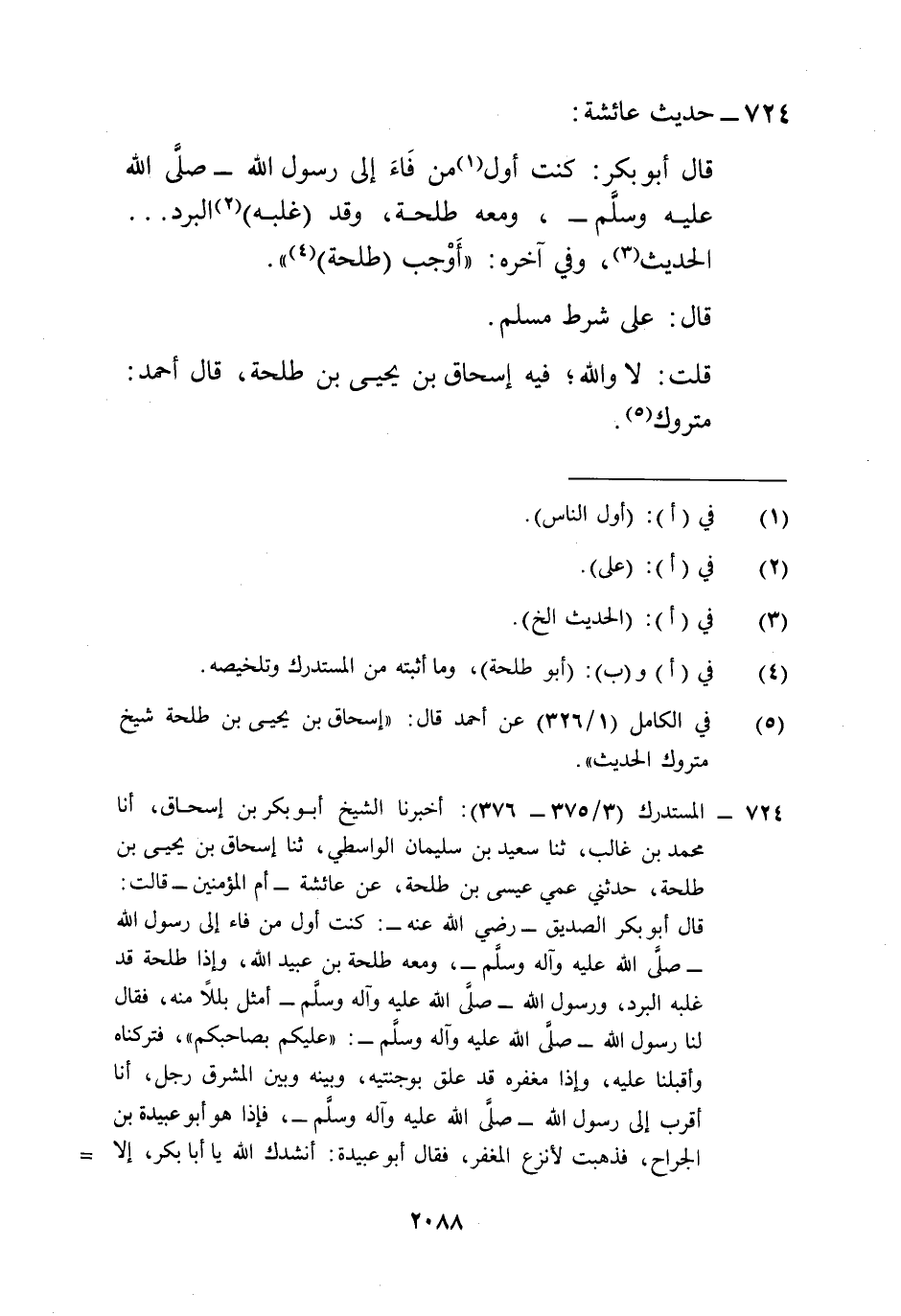 724 - المستدرك (3/ 375 - 376): أخبرنا الشيخ أبو بكر بن إسحاق، أنا محمد بن غالب، ثنا سعيد بن سليمان الواسطي، ثنا إسحاق بن يحيى بن طلحة، حدثني عمي عيسى بن طلحة، عن عائشة -أم المؤمنين- قالت: قال أبو بكر الصديق -رضي الله عنه-: كنت أول من فاء إلى رسول الله -صلى الله عليه وآله وسلم-، ومعه طلحة بن عبيد الله، وإذا طلحة قد غلبه البرد، ورسول الله -صلى الله عليه وآله وسلم- أمثل بللاً منه، فقال لنا رسول الله -صلى الله عليه وآله وسلم-: "عليكم بصاحبكم"، فتركناه وأقبلنا عليه، وإذا مغفره قد علق بوجنتيه، وبينه وبين الشرق رجل، أنا أقرب إلى رسول الله -صلى الله عليه وآله وسلم-، فإذا هو أبو عبيدة بن الجراح، فذهبت لأنزع المغفر، فقال أبو عبيدة: أنشدك الله يا أبا بكر، إلا =