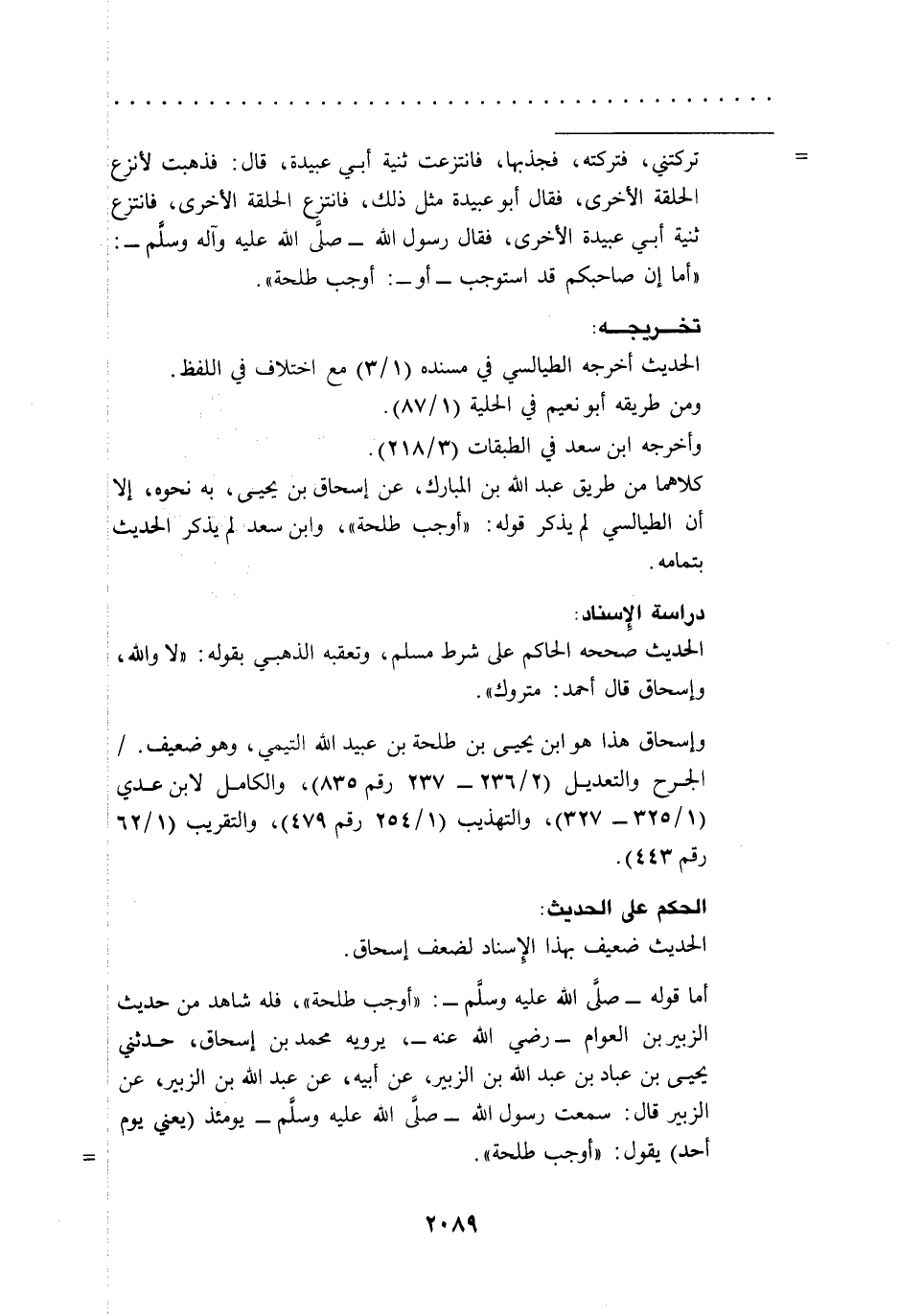أما قوله -صلى الله عليه وسلم-: "أوجب طلحة"، فله شاهد من حديث الزبير بن العوام -رضي الله عنه-، يرويه محمد بن إسحاق، حدثني يحيى بن عباد بن عبد الله بن الزبير، عن أبيه، عن عبد الله بن الزبير، عن الزبير قال: سمعت رسول الله -صلى الله عليه وسلم- يومئذ (يعني يوم أحد) يقول: "أوجب طلحة". =