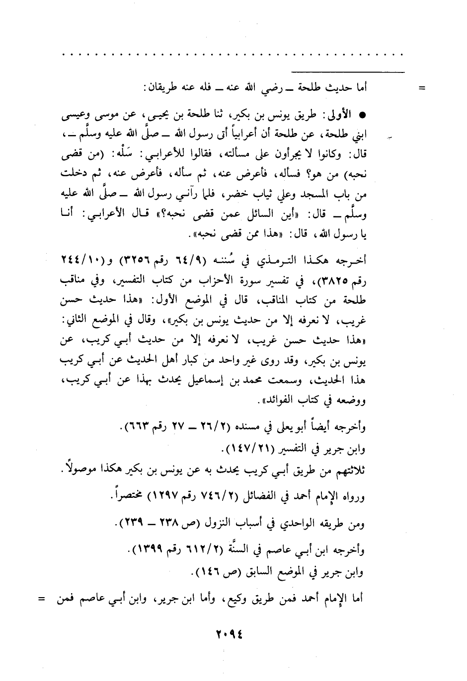 * الأولى: طريق يونس بن بكير، ثنا طلحة بن يحيى، عن موسى وعيسى ابني طلحة، عن طلحة أن أعرابياً أتى رسول الله -صلى الله عليه وسلم-، قال: وكانوا لا يجرأون على مسألته، فقالوا للأعرابي: سَلْه: (من قضى نحبه) من هو؟ فسأله، فأعرض عنه، ثم سأله، فأعرض عنه، ثم دخلت من باب المسجد وعلي ثياب خضر، فلما رآني رسول الله -صلى الله عليه وسلم- قال: "أين السائل عمن قضى نحبه؟ " قال الأعرابي: أنا يا رسول الله، قال: "هذا ممن قضى نحبه".