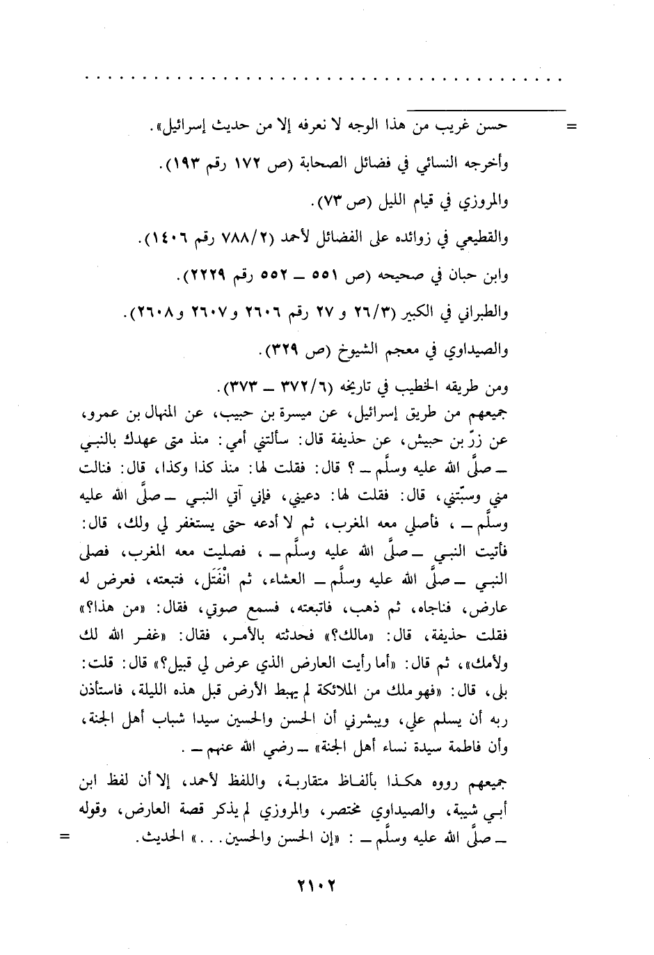 جميعهم من طريق إسرائيل، عن ميسرة بن حبيب، عن المنهال بن عمرو، عن زرّ بن حبيش، عن حذيفة قال: سألتني أمي: منذ متى عهدك بالنبي -صلى الله عليه وسلم-؟ قال: فقلت لها: منذ كذا وكذا، قال: فنالت مني وسبتني، قال: فقلت لها: دعيني، فإني آتي النبي -صلَّى الله عليه وسلَّم-، فأصلي معه المغرب، ثم لا أدعه حتى يستغفر لي ولك، قال: فأتيت النبي -صلى الله عليه وسلم-، فصليت معه المغرب، فصلى النبي -صلى الله عليه وسلم- العشاء، ثم انْفَتَل، فتبعته، فعرض له عارض، فناجاه، ثم ذهب، فاتبعته، فسمع صوتي، فقال: "من هذا؟ " فقلت حذيفة، قال: "مالك؟ "فحدثته بالأمر، فقال: "غفر الله لك ولأمك"، ثم قال: "أما رأيت العارض الذي عرض لي قبيل؟ " قال: قلت: بلى، قال: "فهو ملك من الملائكة لم يهبط الأرض قبل هذه الليلة، فاستأذن ربه أن يسلم علي، ويبشرني أن الحسن والحسن سيدا شباب أهل الجنة، وأن فاطمة سيدة نساء أهل الجنة" -رضي الله عنهم-.