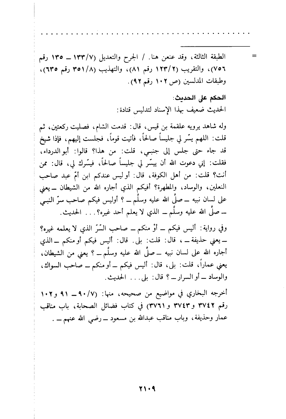 وله شاهد يرويه علقمة بن قيس، قال: قدمت الشام، فصليت ركعتين، ثم قلت: اللهم يسر لي جليساً صالحاً، فأتيت قوماً، فجلست إليهم، فإذا شيخ قد جاء حتى جلس إلى جنبي، قلت: من هذا؟ قالوا: أبو الدرداء، فقلت: إني دعوت الله أن ييسر لي جليساً صالحاً، فيسّرك لي، قال: ممن أنت؟ قلت: من أهل الكوفة، قال: أوليس عندكم ابن أمّ عبد صاحب النعلين، والوساد، والمطهرة؟ أفيكم الذي أجاره الله من الشيطان -يعني على لسان نبيه -صلى الله عليه وسلم-؟ أوليس فيكم صاحب سرّ النبي -صلى الله عليه وسلم- الذي لا يعلم أحد غيره؟ ... الحديث.