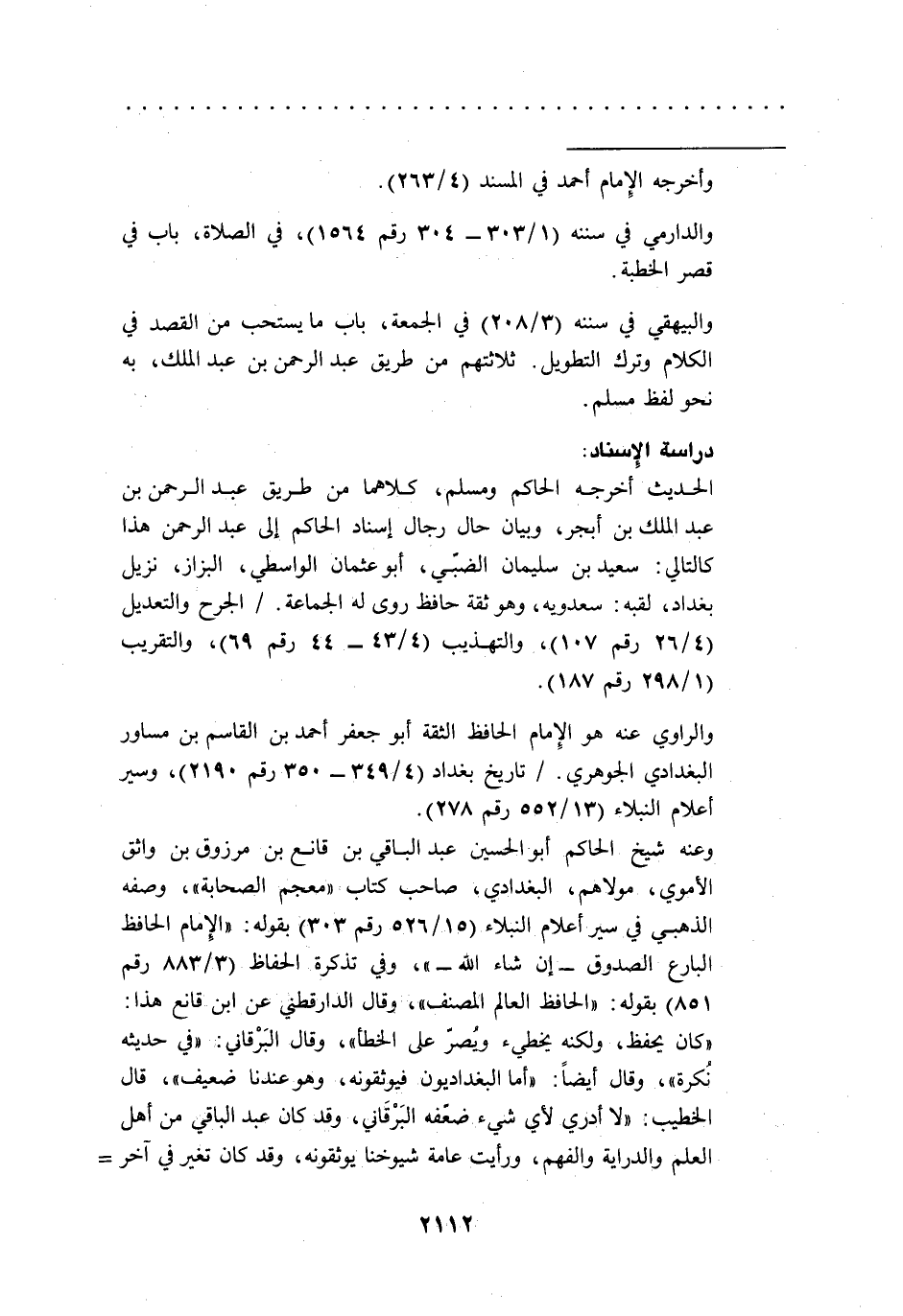 والبيهقي في سننه (3/ 208) في الجمعة، باب ما يستحب من القصد في الكلام وترك التطويل. ثلاثتهم من طريق عبد الرحمن بن عبد الملك، به نحو لفظ مسلم.