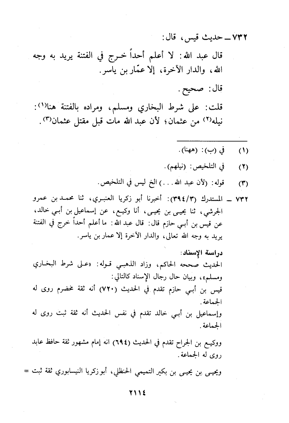 732 - المستدرك (3/ 394): أخبرنا أبو زكريا العنبري، ثنا محمد بن عمرو الجرشي، ثنا يحيى بن يحيى، أنا وكيع، عن إسماعيل بن أبي خالد، عن قيس بن أبي حازم قال: قال عبد الله: ما أعلم أحداً خرج في الفتنة يريد به وجه الله تعالى، والدار الآخرة إلا عمار بن ياسر.