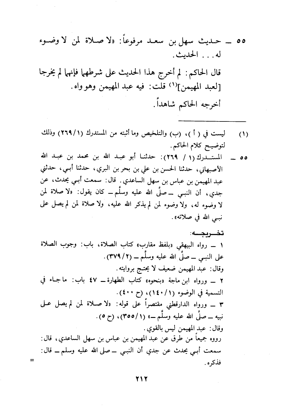 55 - المستدرك (1/ 269): حدثنا أبو عبد الله بن محمد بن عبد الله الأصبهاني، حدثنا الحسن بن علي بن بحر بن البري، حدثنا أبي، حدثني عبد المهيمن بن عباس بن سهل الساعدي. قال: سمعت أبي يحدث، عن جدي، أن النبي -صلى الله عليه وسلم- كان يقول: "لا صلاة لمن لا وضوء له، ولا وضوء لمن لم يذكر الله عليه، ولا صلاة لمن لم يصل على نبي الله في صلاته".