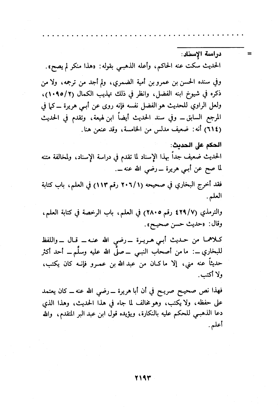 فهذا نص صحيح صريح في أن أبا هريرة -رضي الله عنه- كان يعتمد على حفظه، ولا يكتب، وهو مخالف لما جاء في هذا الحديث، وهذا الذي دعا الذهبي للحكم عليه بالنكارة، ويؤيده قول ابن عبد البر المتقدم، والله أعلم.