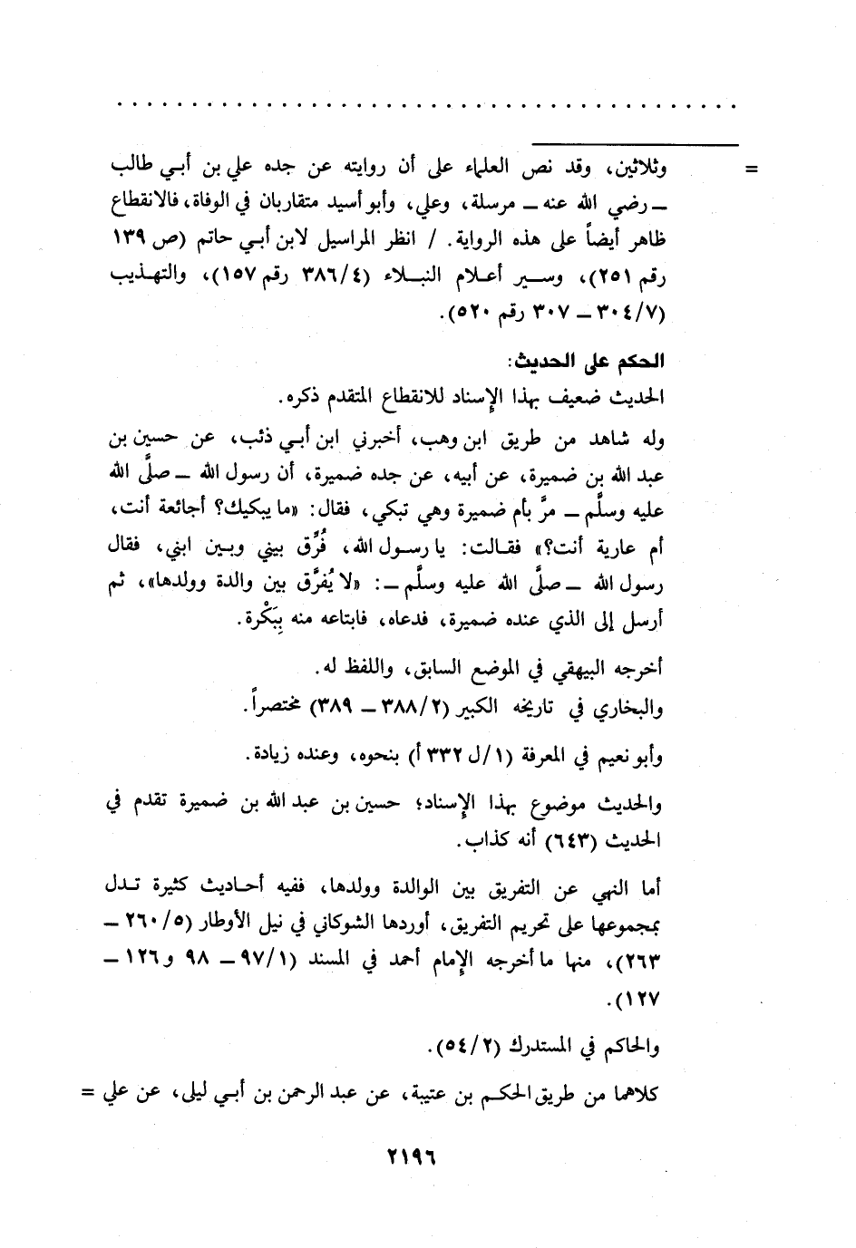 أما النهي عن التفريق بين الوالدة وولدها، ففيه أحاديث كثيرة تدل بمجموعها على تحريم التفريق، أوردها الشوكاني في نيل الأوطار (5/ 260 - 263)، منها ما أخرجه الإمام أحمد في المسند (1/ 97 - 98 و126 - 127).