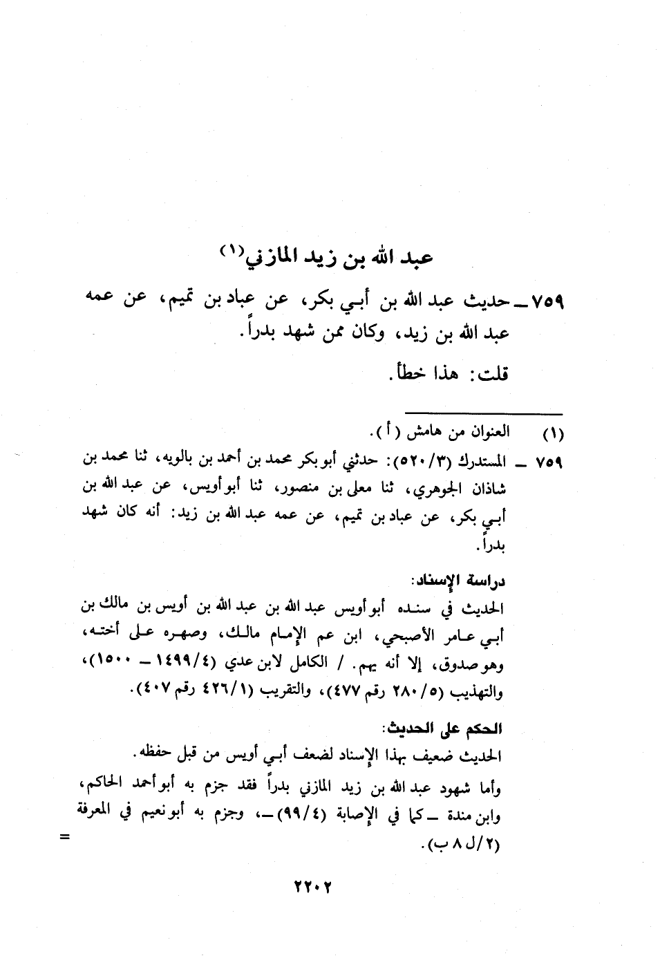 759 - المستدرك (3/ 520): حدثني أبو بكر محمد بن أحمد بن بالويه، ثنا محمد بن شاذان الجوهري، ثنا معلى بن منصور، ثنا أبو أويس، عن عبد الله بن أبي بكر، عن عباد بن تميم، عن عمه عبد الله بن زيد: أنه كان شهد بدراً.