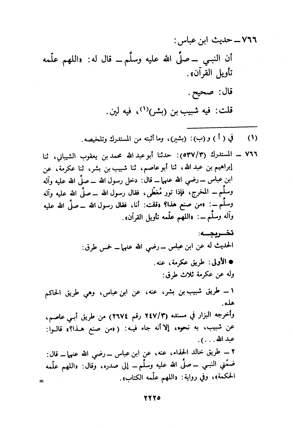 766 - المستدرك (3/ 537): حدثنا أبو عبد الله محمد بن يعقوب الشيباني، ثنا إبراهيم بن عبد الله، ثنا أبو عاصم، ثنا شبيب بن بشر، ثنا عكرمة، عن ابن عباس -رضي الله عنهما- قال: دخل رسول الله -صلى الله عليه وآله وسلم- المخرج، فإذا تور مُغطّى، فقال رسول الله -صلى الله عليه وآله وسلم-: "من صنع هذا؟ "قلت: أنا، فقال رسول الله -صلى الله عليه وآله وسلم-: "اللهم علّمه تأويل القرآن".