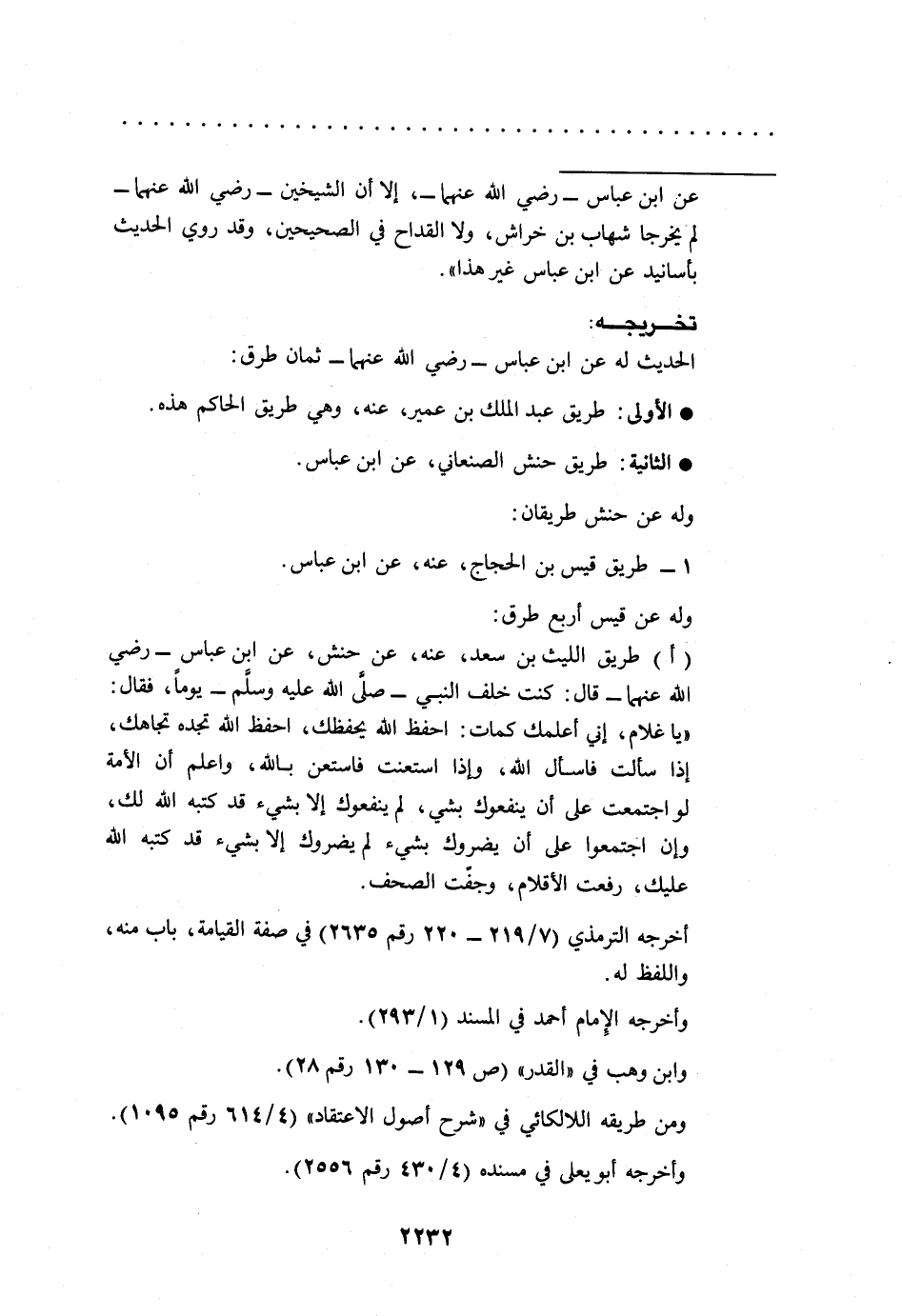 (أ) طريق الليث بن سعد، عنه، عن حنش، عن ابن عباس -رضي الله عنهما- قال: كنت خلف النبي -صلى الله عليه وسلم- يوماً، فقال: "يا غلام، إني أعلمك كمات: احفظ الله يحفظك، احفظ الله تجده تجاهك، إذا سألت فاسأل الله، وإذا استعنت فاستعن بالله، واعلم أن الأمة لو اجتمعت على أن ينفعوك بشي، لم ينفعوك إلا بشيء قد كتبه الله لك، وإن اجتمعوا على أن يضروك بشيء لم يضروك إلا بشيء قد كتبه الله عليك، رفعت الأقلام، وجفت الصحف.