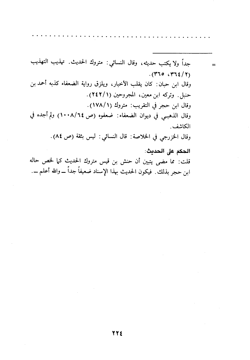 قلت: مما مضى يتبين أن حنش بن قيس متروك الحديث كما لخص حاله ابن حجر بذلك. فيكون الحديث بهذا الإسناد ضعيفاً جداً -والله أعلم-.