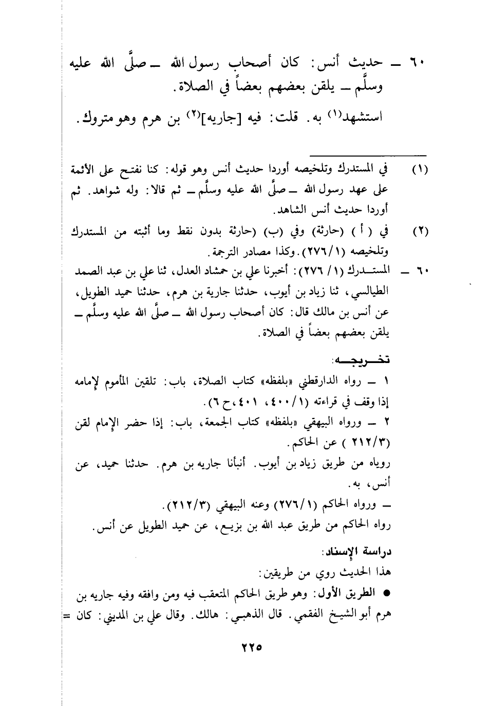 60 - المستدرك (1/ 276): أخبرنا علي بن حمشاد العدل، ثنا علي بن عبد الصمد الطيالسي، ثنا زياد بن أيوب، حدثنا جارية بن هرم، حدثنا حميد الطويل، عن أنس بن مالك قال: كان أصحاب رسول الله -صلى الله عليه وسلم- يلقن بعضهم بعضاً في الصلاة.