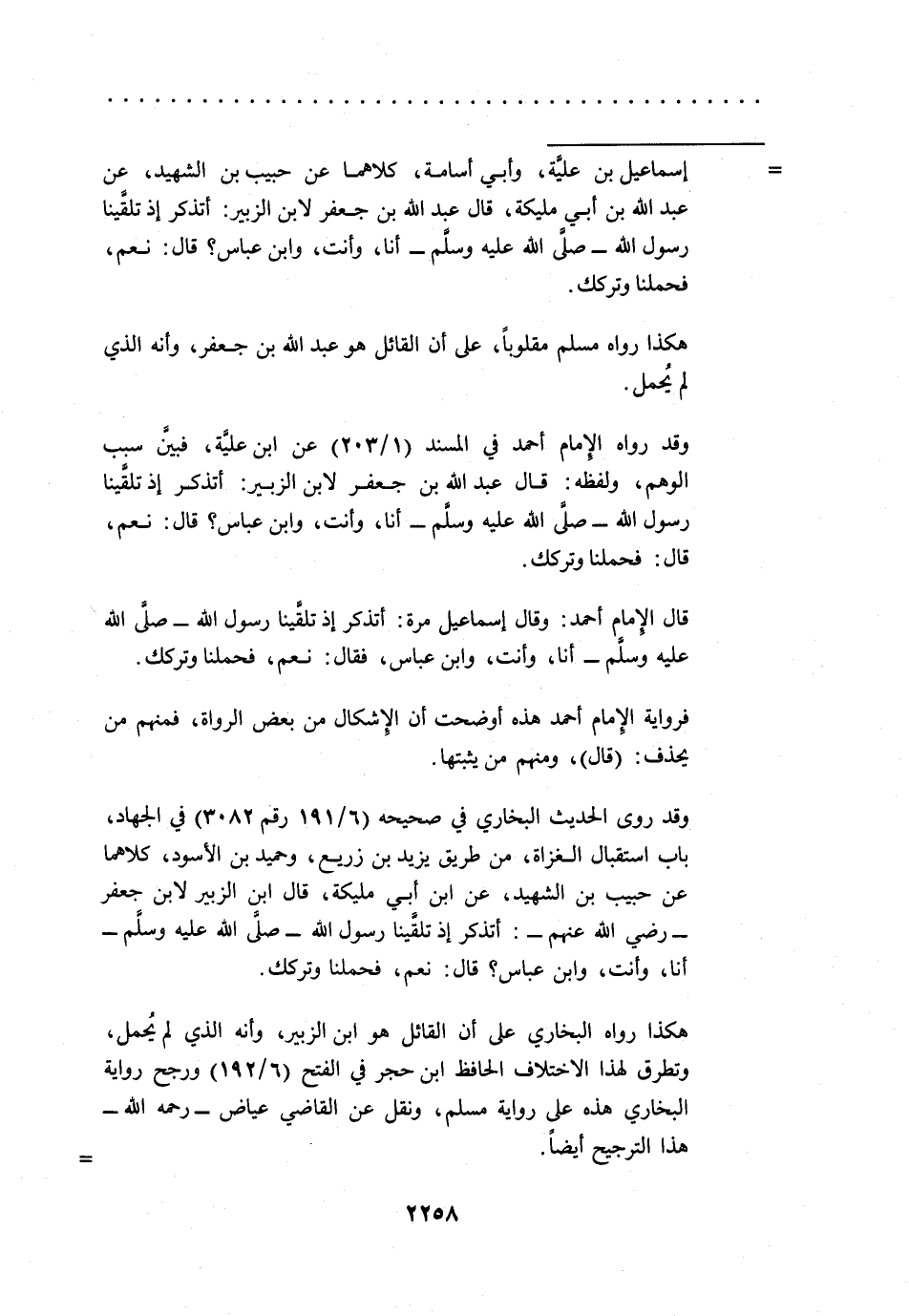 = إسماعيل بن عليَّة، وأبي أسامة، كلاهما عن حبيب بن الشهيد، عن عبد الله بن أبي مليكة، قال عبد الله بن جعفر لابن الزبير: أتذكر إذ تلقَّينا رسول الله -صلى الله عليه وسلم- أنا، وأنت، وابن عباس؟ قال: نعم، فحملنا وتركك.