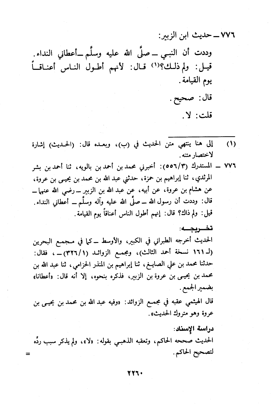 776 - المستدرك (3/ 556): أخبرني محمد بن أحمد بن بالويه، ثنا أحمد بن بشر المرثدي، ثنا إبراهيم بن حمزة، حدثني عبد الله بن محمد بن يحيى بن عروة، عن هشام بن عروة، عن أبيه، عن عبد الله بن الزبير -رضي الله عنهما- قال: وددت أن رسول الله -صلى الله عليه وآله وسلم- أعطاني النداء.