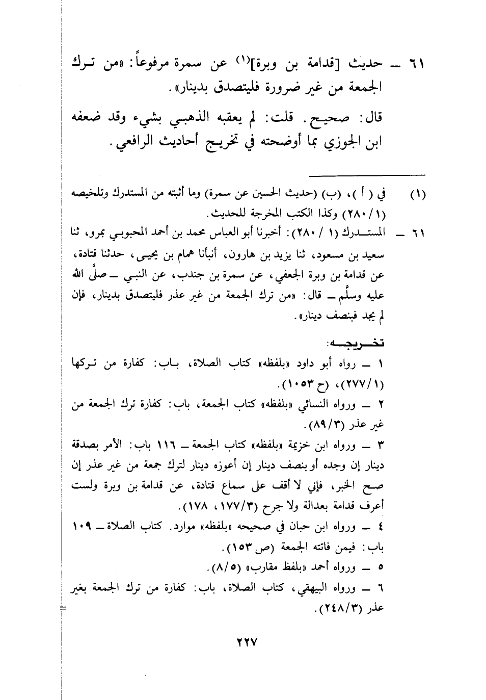 61 - المستدرك (1/ 280): أخبرنا أبو العباس محمد بن أحمد المحبوبي بمرو، ثنا سعيد بن مسعود، ثنا يزيد بن هارون، أنبأنا همام بن يحيى، حدثنا قتادة، عن قدامة بن وبرة الجعفي، عن سمرة بن جندب، عن النبي -صلى الله عليه وسلم- قال: "من ترك الجمعة من غير عذر فليتصدق بدينار، فإن لم يجد فبنصف دينار".