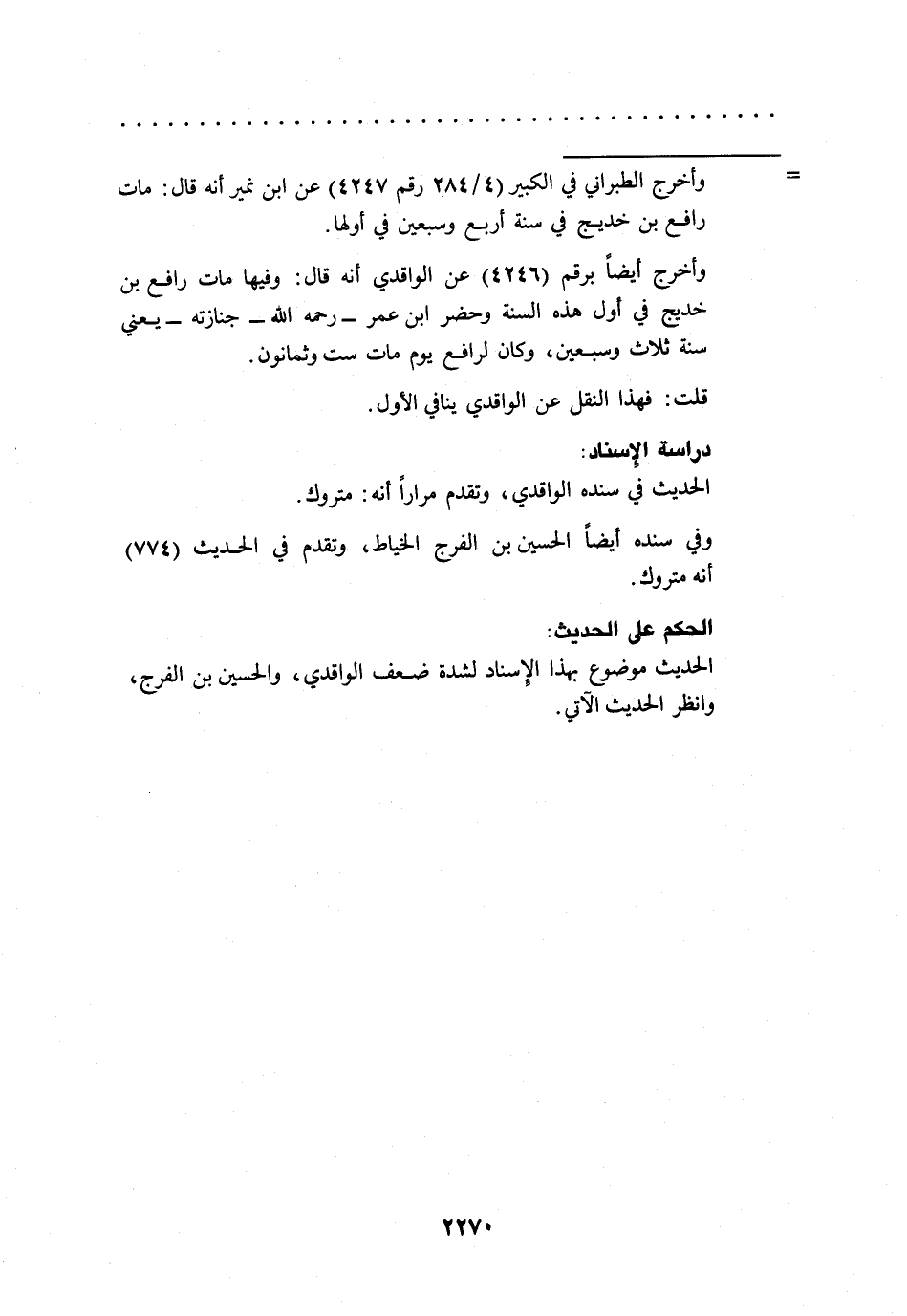 وأخرج أيضاً برقم (4246) عن الواقدي أنه قال: وفيها مات رافع بن خديج في أول هذه السنة وحضر ابن عمر -رحمه الله- جنازته -يعني سنة ثلاث وسبعين، وكان لرافع يوم مات ست وثمانون.