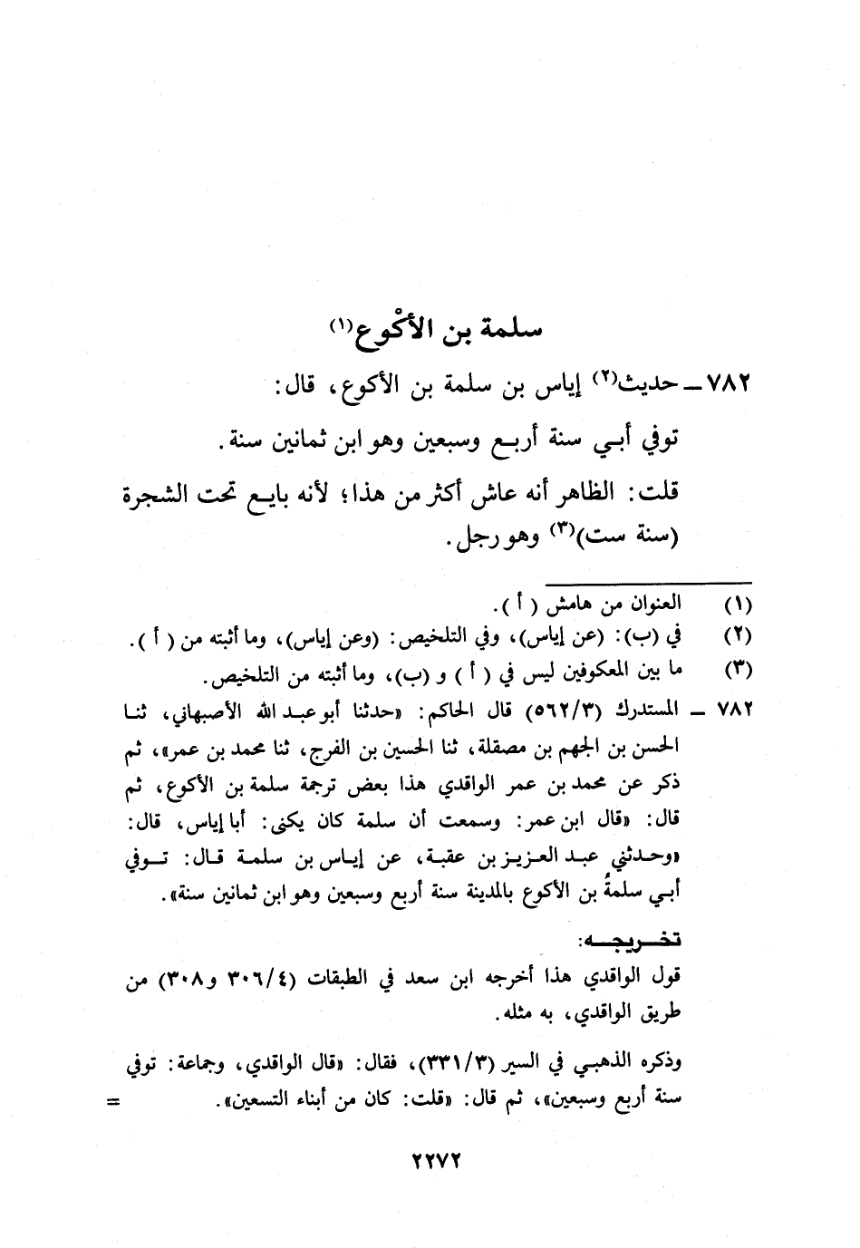 782 - المستدرك (3/ 562) قال الحاكم: "حدثنا أبو عبد الله الأصبهاني، ثنا الحسن بن الجهم بن مصقلة، ثنا الحسين بن الفرج، ثنا محمد بن عمر"، ثم ذكر عن محمد بن عمر الواقدي هذا بعض ترجمة سلمة بن الأكوع، ثم قال: "قال ابن عمر: وسمعت أن سلمة كان يكنى: أبا إياس، قال: "وحدثني عبد العزيز بن عقبة، عن إياس بن سلمة قال: توفي أبي سلمة بن الأكوع بالمدينة سنة أربع وسبعين وهو ابن ثمانين سنة".