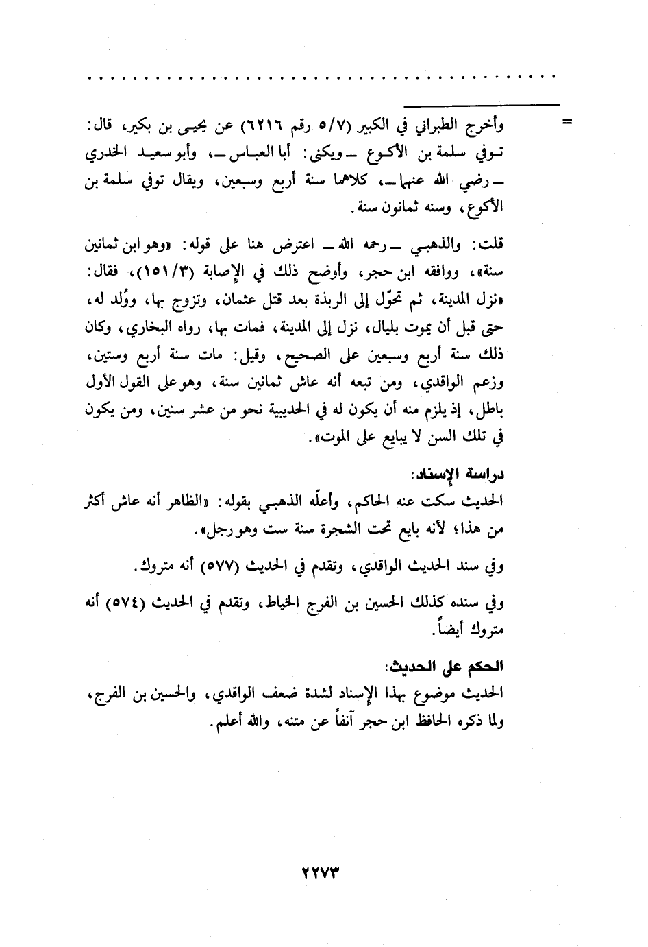 = وأخرج الطبراني في الكبير (7/ 5رقم 6216) عن يحيى بن بكير، قال: توفي سلمة بن الأكوع -ويكنى: أبا العباس-، وأبو سعيد الخدري -رضي الله عنهما-، كلاهما سنة أربع وسبعين، ويقال توفي سلمة بن الأكوع، وسنه ثمانون سنة.