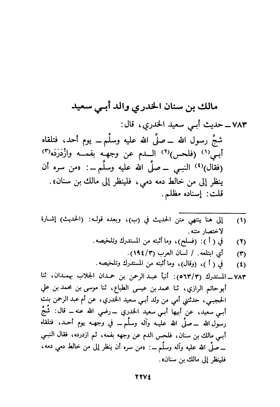 783 - المستدرك (3/ 563): أنبأ عبد الرحمن بن حمدان الجلاب بهمدان، ثنا أبو حاتم الرازي، ثنا محمد بن عيسى الطباع، ثنا موسى بن محمد بن علي الحجبي، حدثتني أمي من ولد أبي سعيد الخدري، عن أم عبد الرحمن بنت أبي سعيد، عن أبيها أبي سعيد الخدري -رضي الله عنه- قال: شُجّ رسول الله -صلى الله عليه وآله وسلم- في وجهه يوم أحد، فتلقاه أبي مالك بن سنان، فلحس الدم عن وجهه بفمه، ثم ازدرده، فقال النبي -صلى الله عليه وآله وسلم-: "من سره أن ينظر إلى من خالط دمي دمه، فلينظر إلى مالك بن سنان".