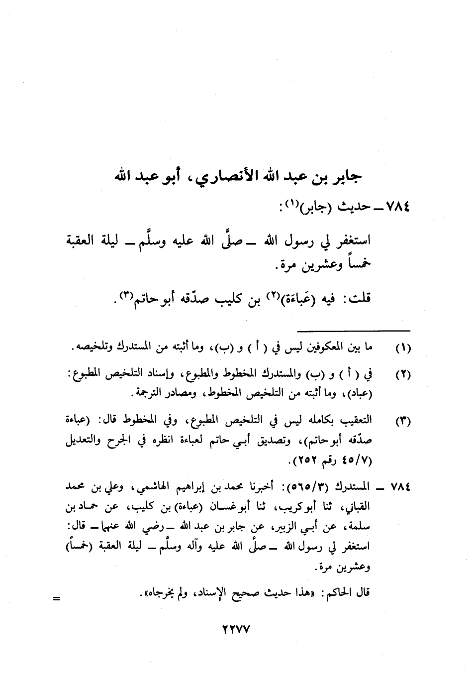 784 - المستدرك (3/ 565): أخبرنا محمد بن إبراهيم الهاشمي، وعلي بن محمد القباني، ثنا أبو كريب، ثنا أبو غسان (عباءة) بن كليب، عن حماد بن سلمة، عن أبي الزبير، عن جابر بن عبد الله -رضي الله عنهما- قال: استغفر لي رسول الله -صلى الله عليه وآله وسلم- ليلة العقبة (خمساً) وعشرين مرة.