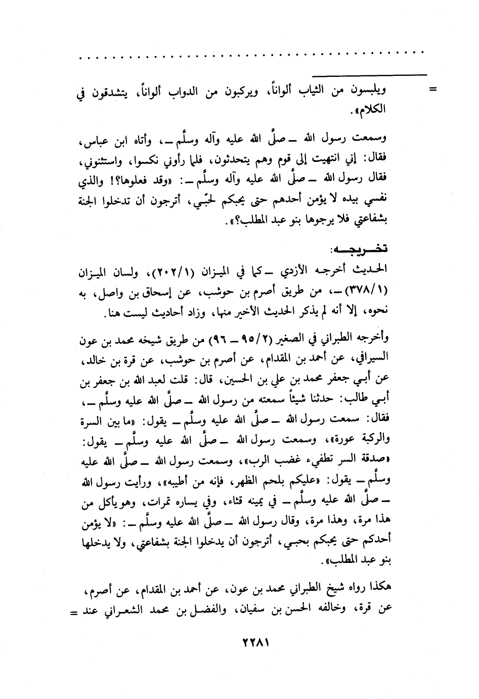 وسمعت رسول الله -صلى الله عليه وآله وسلم-، وأتاه ابن عباس، فقال: إني انتهيت إلى قوم وهم يتحدثون، فلما رأوني نكسوا، واستثوني، فقال رسول الله -صلى الله عليه وآله وسلم-: "وقد فعلوها؟! والذي نفسي بيده لا يؤمن أحدهم حتى يحبكم لحبّي، أترجون أن تدخلوا الجنة بشفاعتي فلا يرجوها بنو عبد المطلب؟ ".