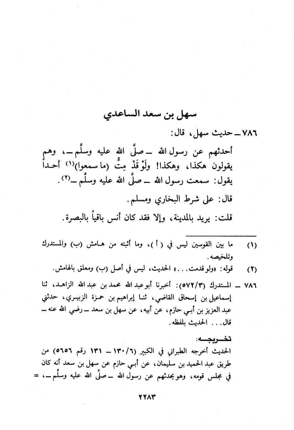 786 - المستدرك (3/ 572): أخبرنا أبو عبد الله محمد بن عبد الله الزاهد، ثنا إسماعيل بن إسحاق القاضي، ثنا إبراهيم بن حمزة الزبيري، حدثني عبد العزيز بن أبي حازم، عن أبيه، عن سهل بن سعد -رضي الله عنه- قال ... الحديث بلفظه.