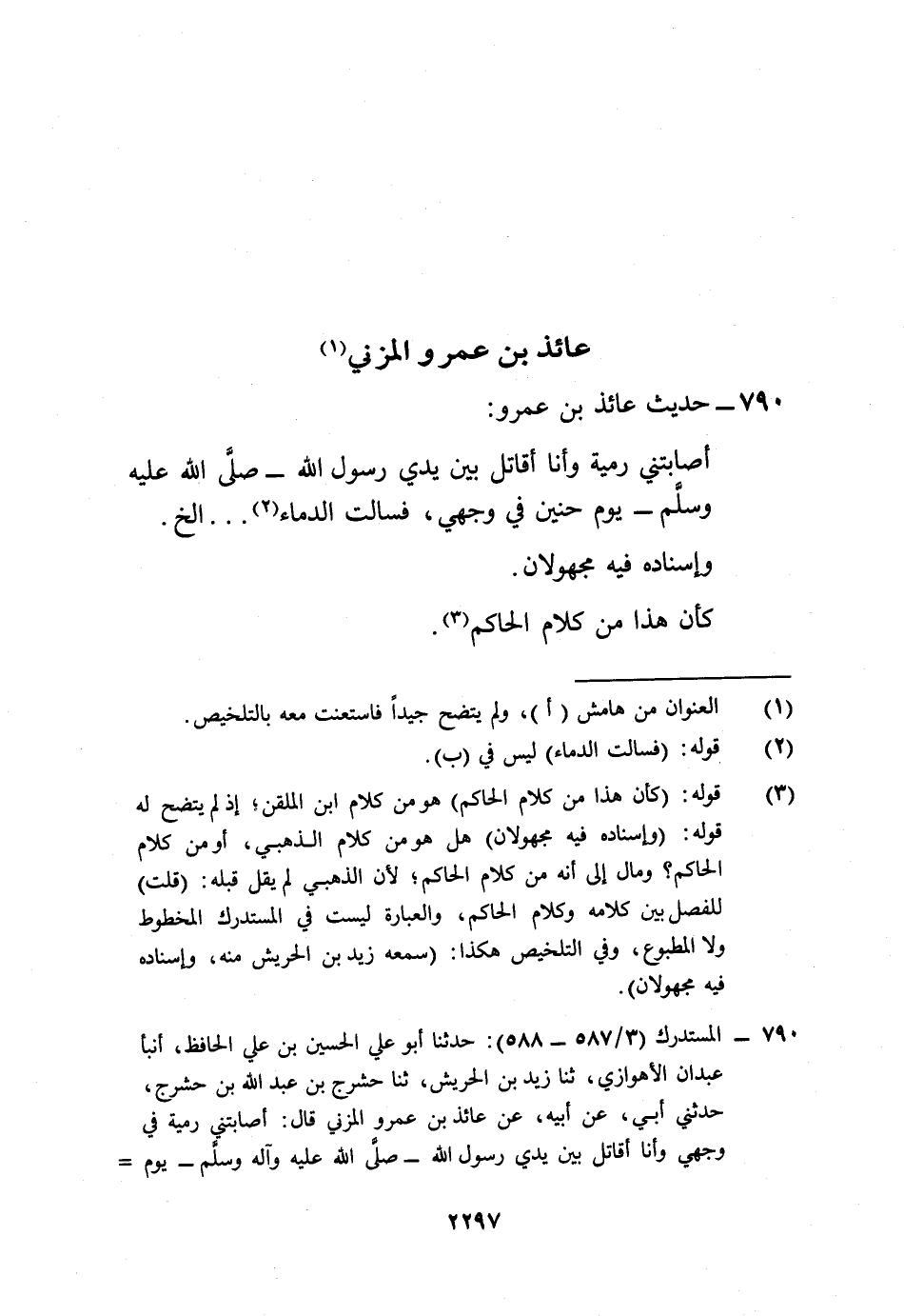 790 - المستدرك (3/ 587 - 588): حدثنا أبو علي الحسين بن علي الحافظ، أنبأ عبدان الأهوازي، ثنا زيد بن الحريش، ثنا حشرج بن عبد الله بن حشرج، حدثني أبي، عن أبيه، عن عائذ بن عمرو المزني قال: أصابتني رمية في وجهي وأنا أقاتل بين يدي رسول الله -صلى الله عليه وآله وسلم- يوم =