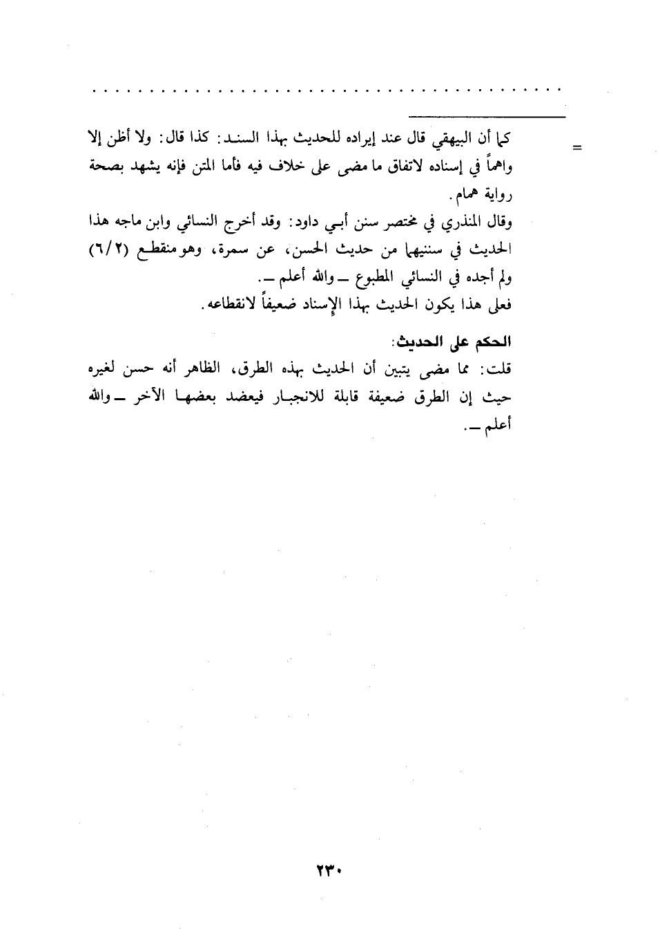 قلت: مما مضى يتبين أن الحديث بهذه الطرق، الظاهر أنه حسن لغيره حيث إن الطرق ضعيفة قابلة للانجبار فيعضد بعضها الآخر -والله أعلم-.
