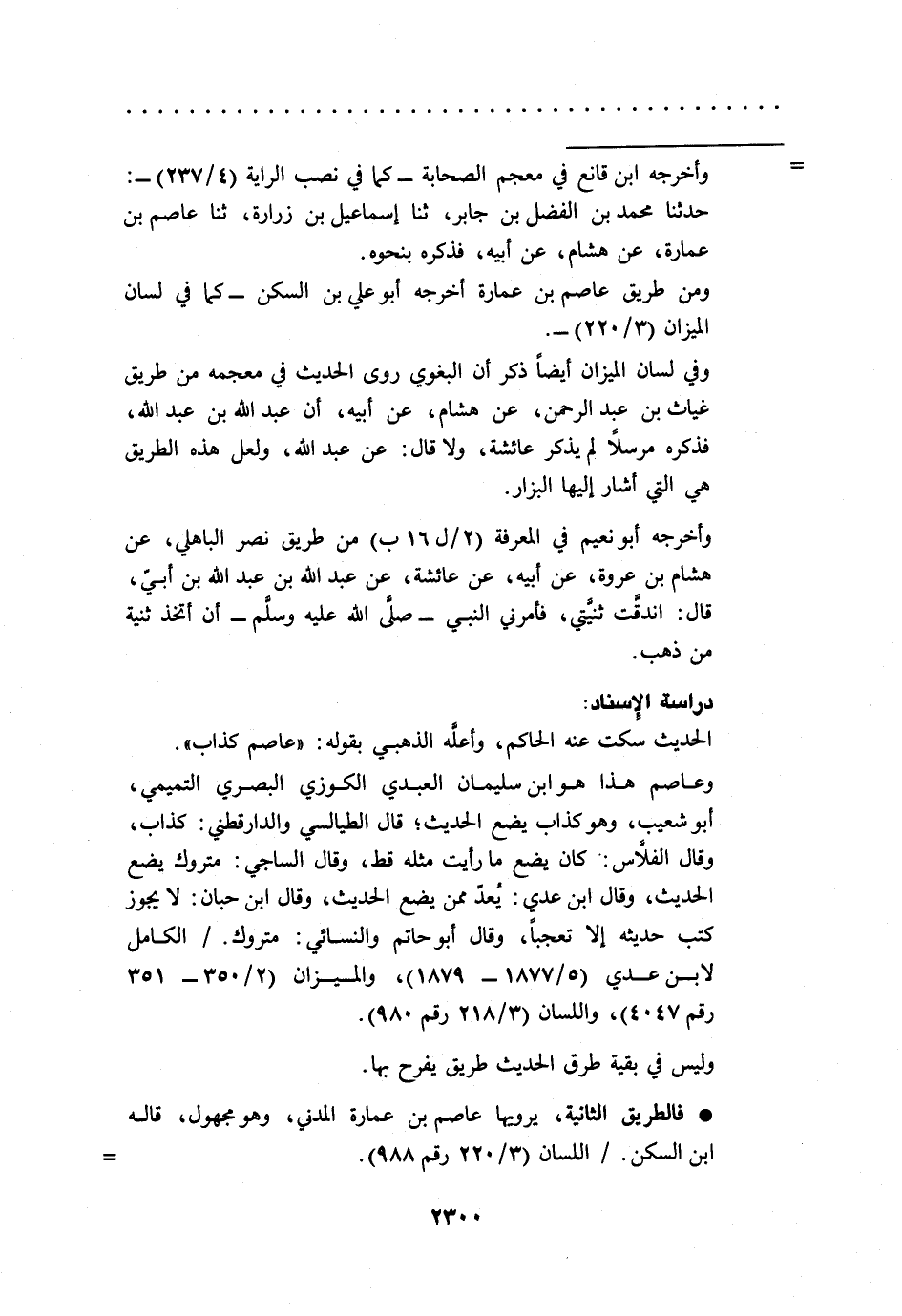 * فالطريق الثانية، يرويها عاصم بن عمارة المدني، وهو مجهول، قاله ابن السكن./ اللسان (3/ 220 رقم 988) =