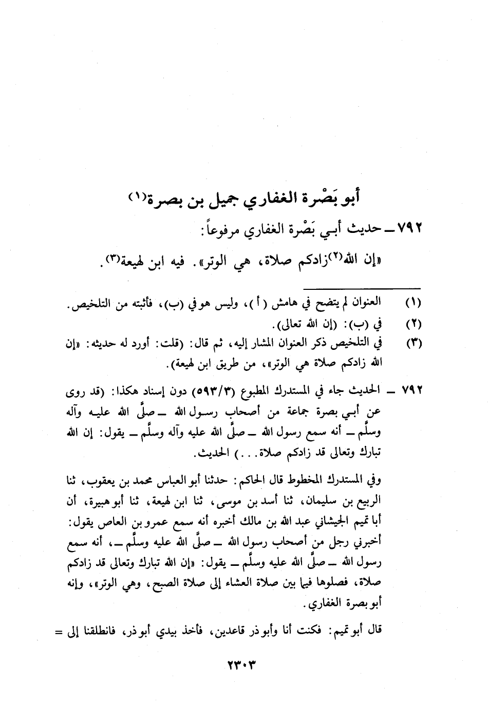وفي المستدرك المخطوط قال الحاكم: حدثنا أبو العباس محمد بن يعقوب، ثنا الربيع بن سليمان، ثنا أسد بن موسى، ثنا ابن لهيعة، ثنا أبو هبيرة، أن أبا تميم الجيشاني عبد الله بن مالك أخبره أنه سمع عمرو بن العاص يقول: أخبرني رجل من أصحاب رسول الله -صلى الله عليه وسلم-، أنه سمع رسول الله -صلى الله عليه وسلم- يقول: "إن الله تبارك وتعالى قد زادكم صلاة، فصلوها فيما بين صلاة العشاء إلى صلاة الصبح، وهي الوتر"، وإنه أبو بصرة الغفاري.