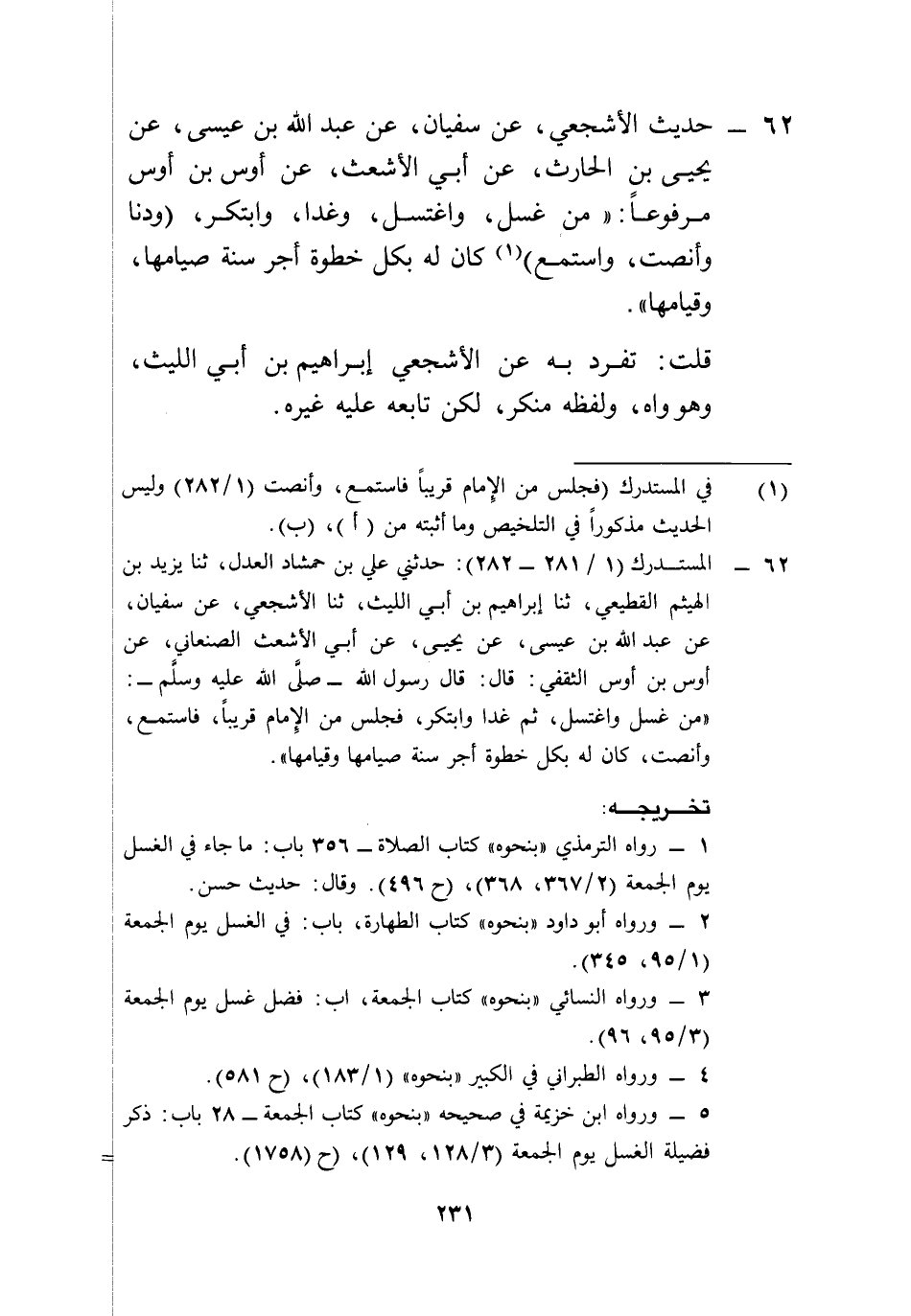 62 - المستدرك (1/ 281 - 282): حدثني علي بن حمشاد العدل، ثنا يزيد بن الهيثم القطيعي، ثنا إبراهيم بن أبي الليث، ثنا الأشجعي، عن سفيان، عن عبد الله بن عيسى، عن يحيى، عن أبي الأشعث الصنعاني، عن أوس بن أوس الثقفي: قال: قال رسول الله -صلى الله عليه وسلم-: "من غسل واغتسل، ثم غدا وابتكر، فجلس من الِإمام قريباً، فاستمع، وأنصت، كان له بكل خطوة أجر سنة صيامها وقيامها".