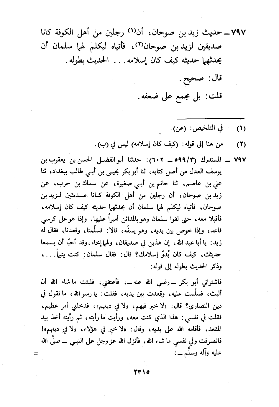 797 - المستدرك (3/ 599 - 602): حدثنا أبو الفضل الحسن بن يعقوب بن يوسف العدل من أصل كتابه، ثنا أبو بكر يحيى بن أبي طالب ببغداد، ثنا علي بن عاصم، ثنا حاتم بن أبي صغيرة، عن سماك بن حرب، عن زيد بن صوحان، أن رجلين من أهل الكوفة كانا صديقين لزيد بن صوحان، فأتياه ليكلم لهما سلمان أن يحدثهما حديثه كيف كان إسلامه، فأقبلا معه، حتى لقوا سلمان وهو بالمدائن أميراً عليها، وإذا هو على كرسي قاعد، وإذا خوص بين يديه، وهو يسفّه، قالا: فسلّمنا، وقعدنا، فقال له زيد: يا أبا عبد الله، إن هذين لي صديقان، ولهما إخاء، وقد أحبّا أن يسمعا حديثك، كيف كان بُدوّ إسلامك؟ قال: فقال سلمان: كنت يتيماً ... ، وذكر الحديث بطوله إلى قوله: