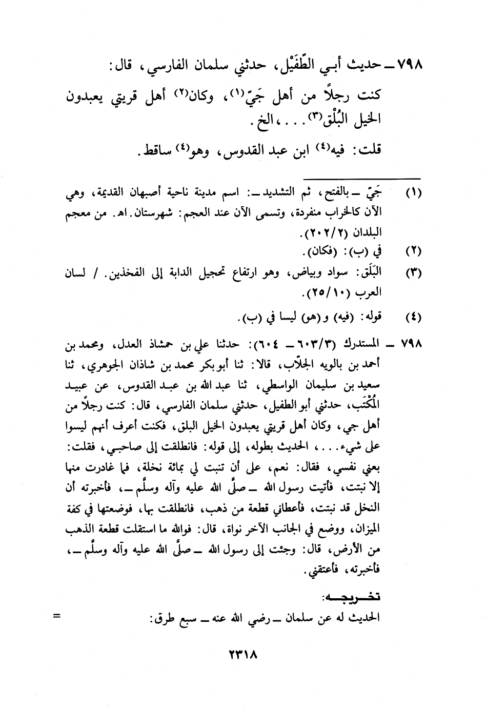 798 - المستدرك (3/ 603 - 604): حدثنا علي بن حمشاذ العدل، ومحمد بن أحمد بن بالويه الجلاّب، قالا: ثنا أبو بكر محمد بن شاذان الجوهري، ثنا سعيد بن سليمان الواسطي، ثنا عبد الله بن عبد القدوس، عن عبيد المُكْتَب، حدثني أبو الطفيل، حدثني سلمان الفارسي، قال: كنت رجلاً من أهل جي، وكان أهل قريتي يعبدون الخيل البلق، فكنت أعرف أنهم ليسوا على شيء ... ، الحديث بطوله، إلى قوله: فانطلقت إلى صاحبي، فقلت: بعني نفسي، فقال: نعم، على أن تنبت لي بمائة نخلة، فما غادرت منها إلا نبتت، فأتيت رسول الله -صلى الله عليه وآله وسلم-، فأخبرته أن النخل قد نبتت، فأعطاني قطعة من ذهب، فانطلقت بها، فوضعتها في كفة الميزان، ووضع في الجانب الآخر نواة، قال: فوالله ما استقلت قطعة الذهب من الأرض، قال: وجئت إلى رسول الله -صلى الله عليه وآله وسلم-، فأخبرته، فأعتقني.