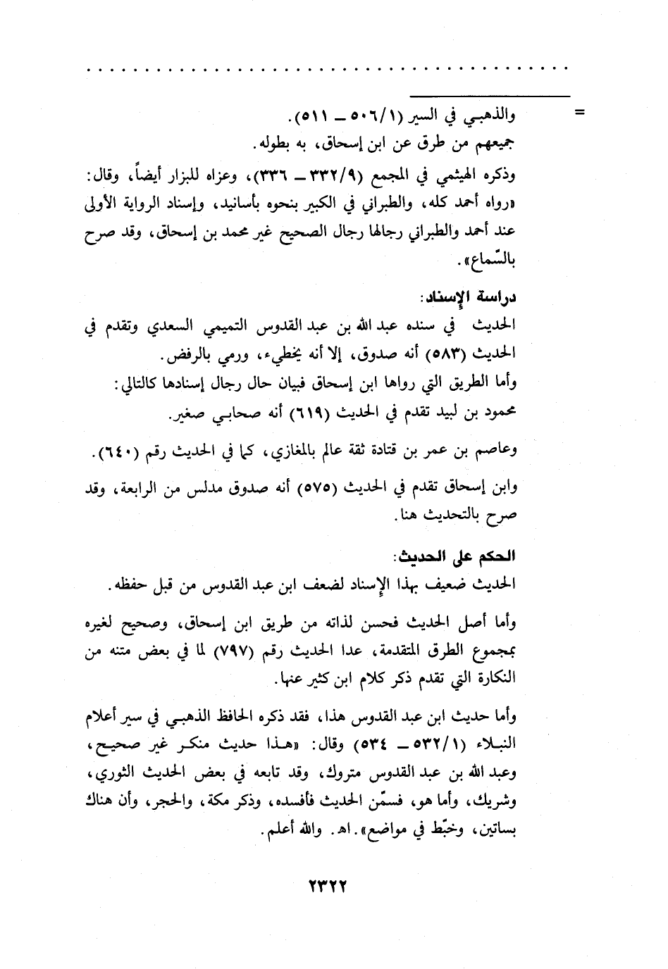 وأما أصل الحديث فحسن لذاته من طريق ابن إسحاق، وصحيح لغيره بمجموع الطرق المتقدمة، عدا الحديث رقم (797) لما في بعض متنه من النكارة التي تقدم ذكر كلام ابن كثير عنها.